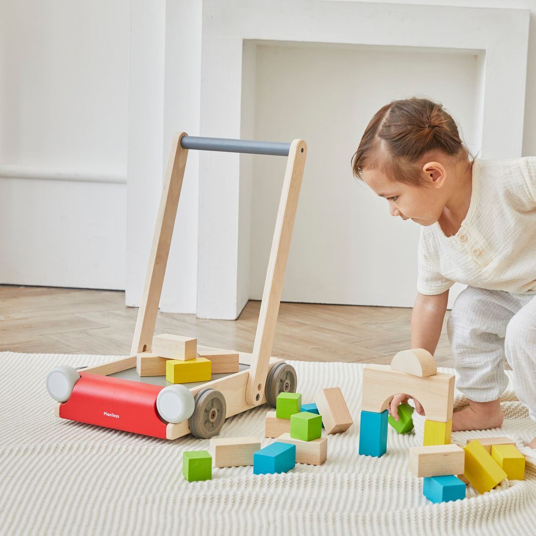 Cruise through early developmental stages with the PlanToys Baby Walker. This walker can help develop fine and gross motor skills while encouraging children to walk on their own two feet. The handle is adjustable to fit various heights along with a tension knob to control wheel speed for safety.