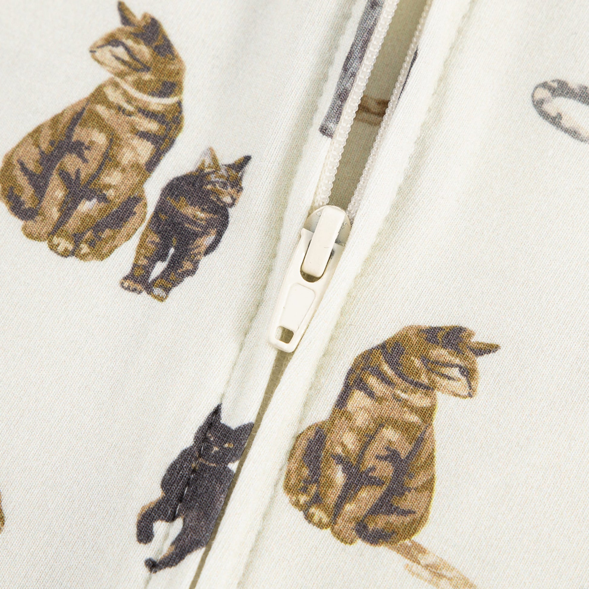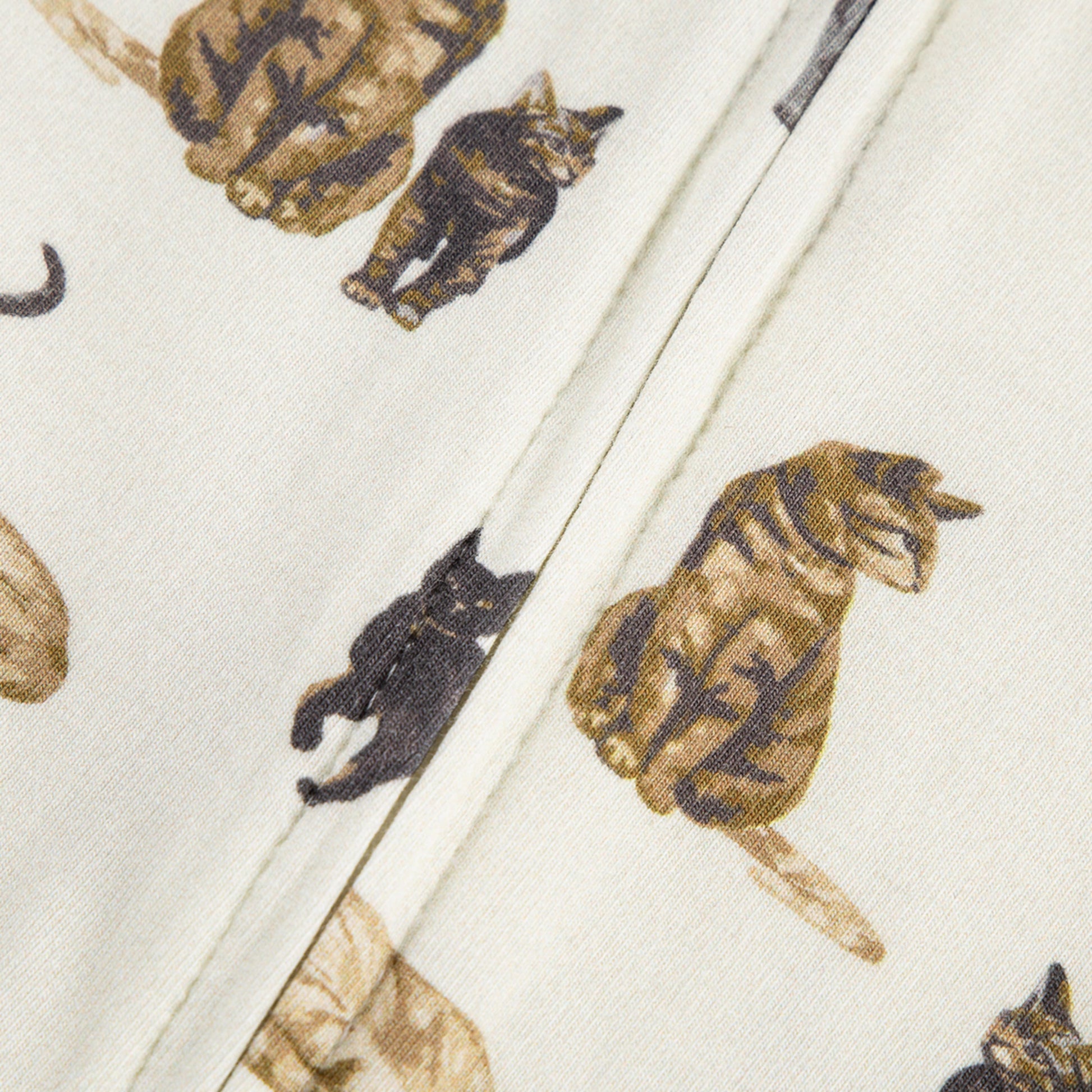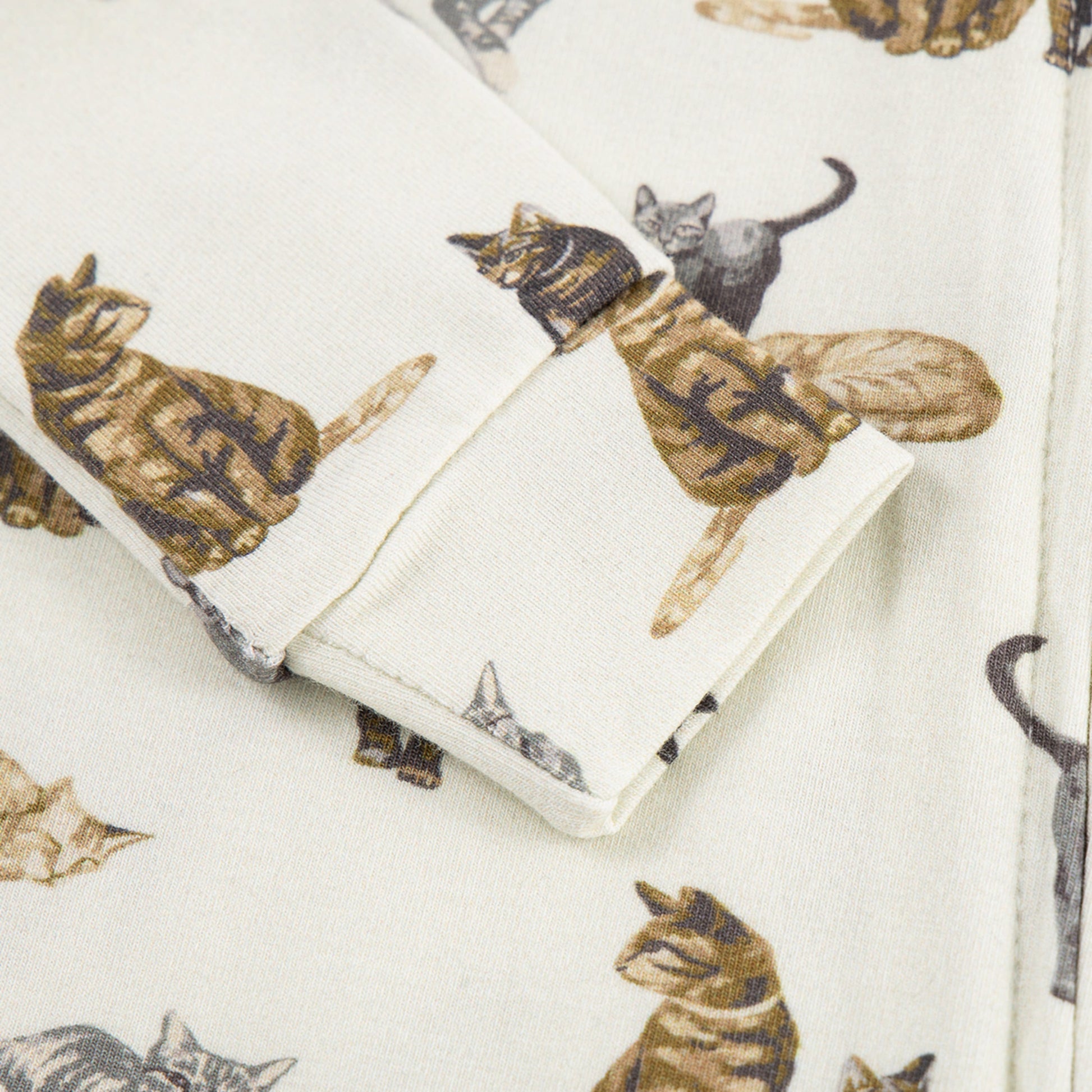 Our extra soft Cotton Stretch Zipper Pajama in the Cat print blurs the lines between sleepy time, playtime, and cuddle time. The open foot detail allows your little ones greater mobility, while the midline, neck-to-knee zipper provides ease and flexibility of changing. Added details include a crew neckline, contrasting wide-band cuffs, and a stylized fabric zipper tab cover.
