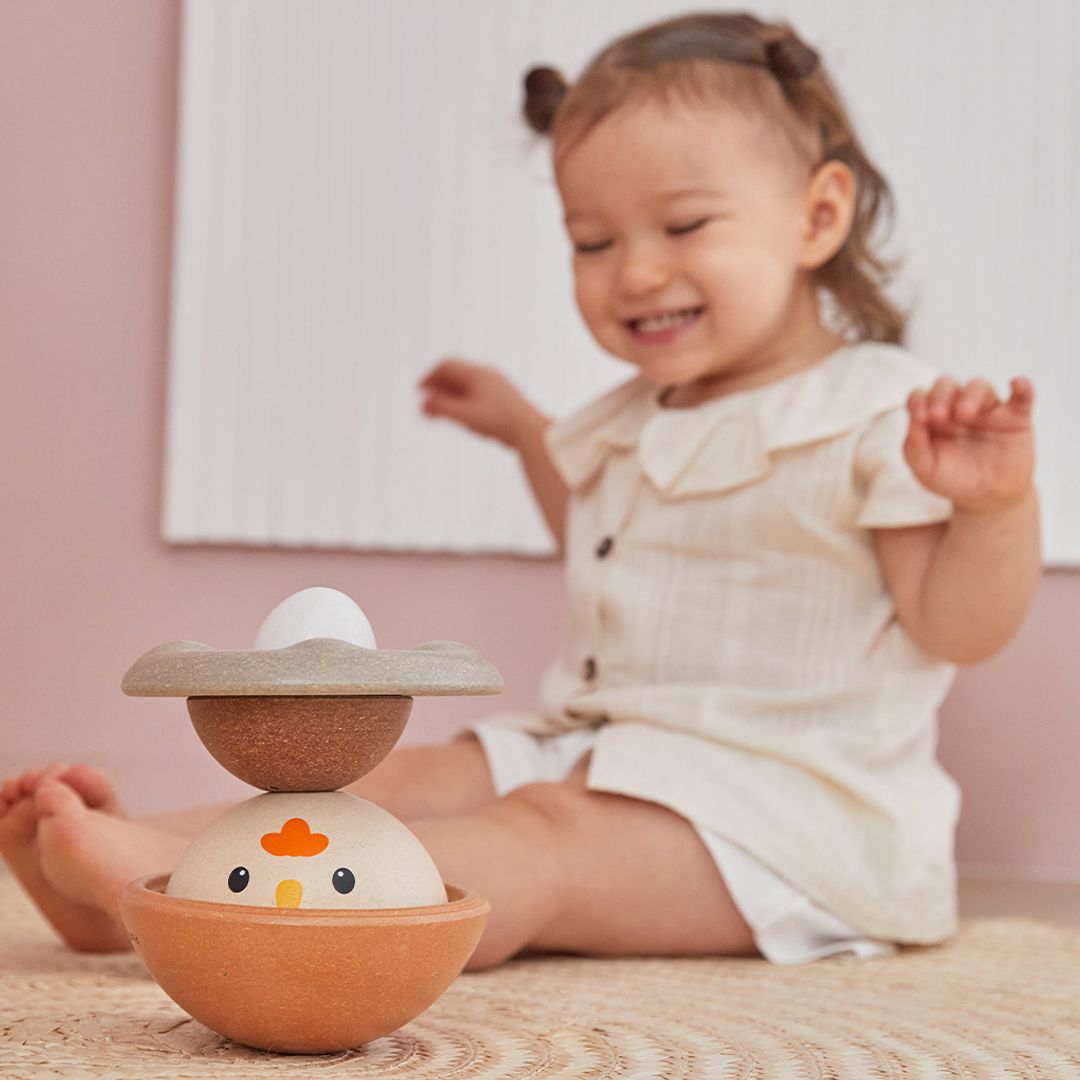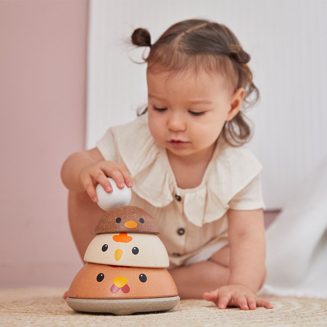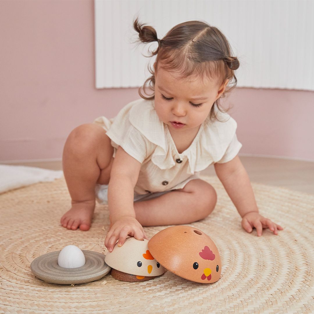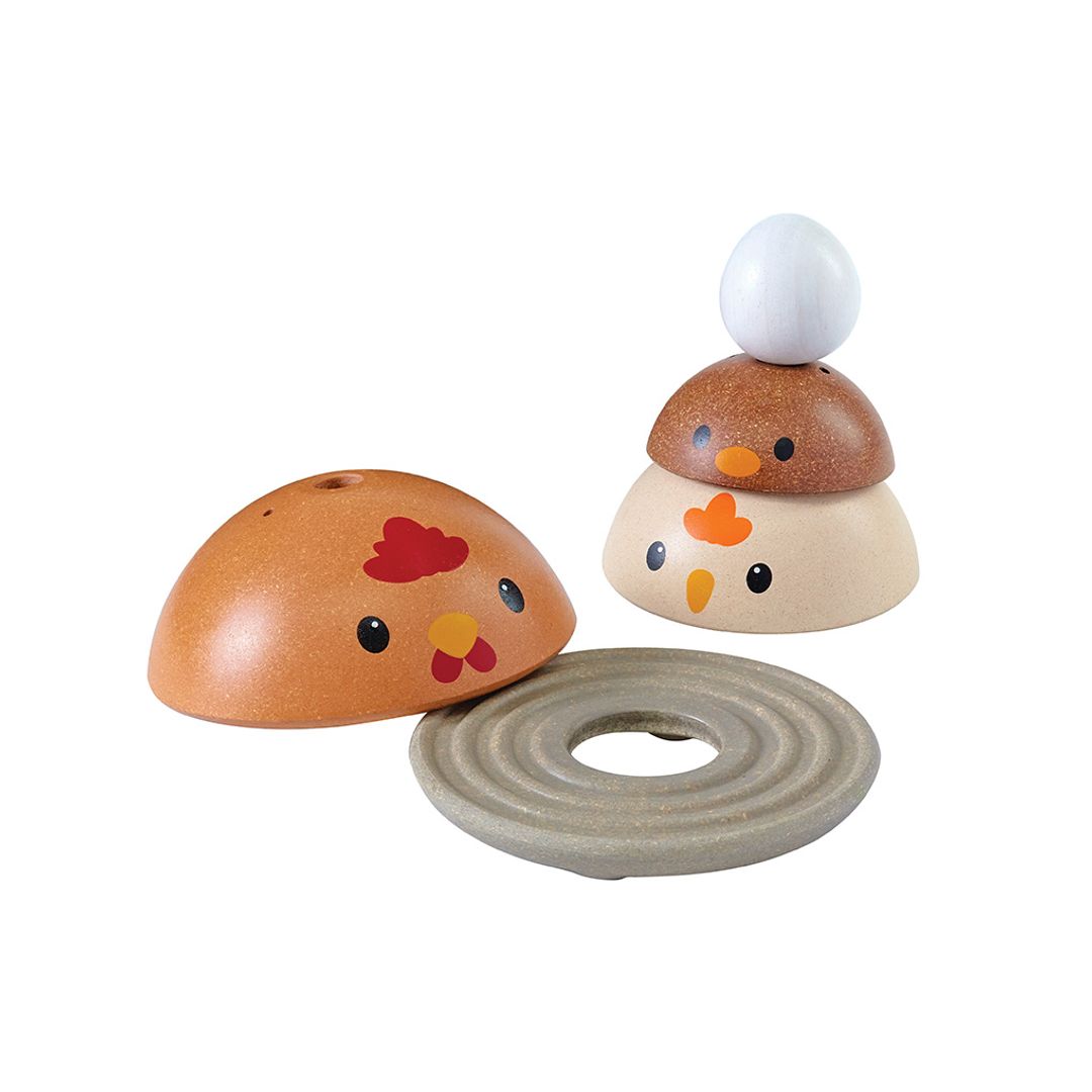 How quickly can you stack the PlanToys Chicken Nesting set? This version comes in the modern rustic colorway. Time yourself and see how advanced your ordering and stacking skills are! Children strengthen fine motor skills, develop logical thinking and problem solving, and explore size/shape recognition through play. Set comes complete with a base for stacking onto and 4 colorful pieces for play. This version is from our Modern Rustic collection. Suitable for children ages 12 months and older. Sustainably made in Thailand using chemical-free rubberwood, non-formaldehyde glue, organic pigments and water-based dyes.