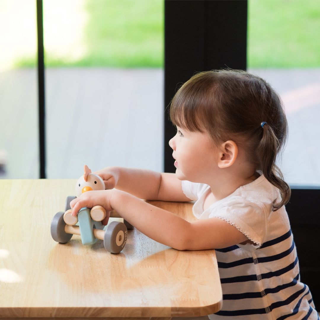 Get in the race car with these fast bunny and chicken! This vehicle comes with a vintage race car theme and features a turning wheel that gives the same movement as a real race car when turning around.