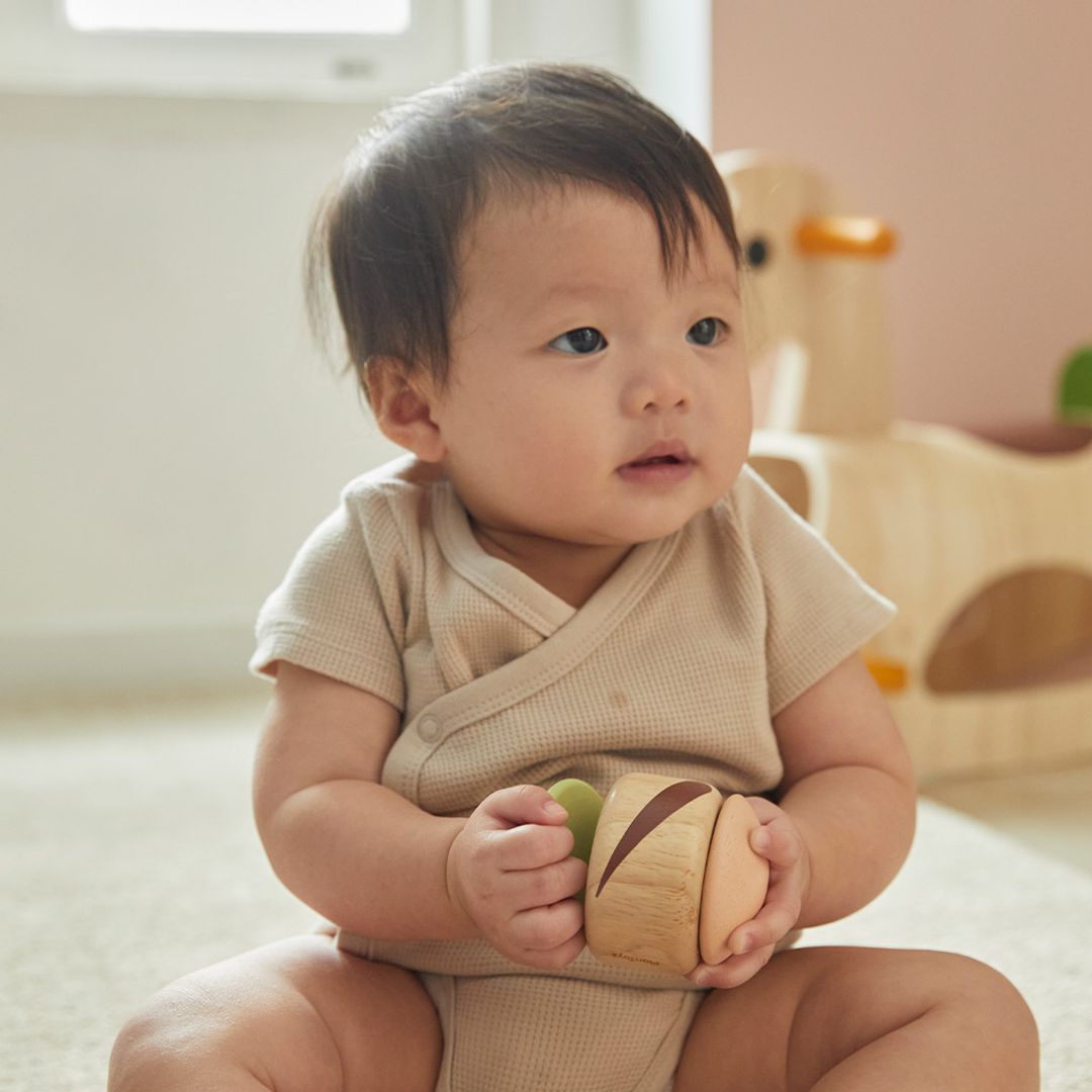 This simple toy creates a soft clapping sound when rolled. The PlanToys wooden Clapping Roller toy delights and amazes wee children. As they roll the toy along the ground, the toy creates a soft clapping sound. This version comes in our modern rustic colorway. The Roller baby toy helps develop fine motor skills and children learn about cause and effect. The roller measures 2.4 x 2.4 x 2.7 inches.