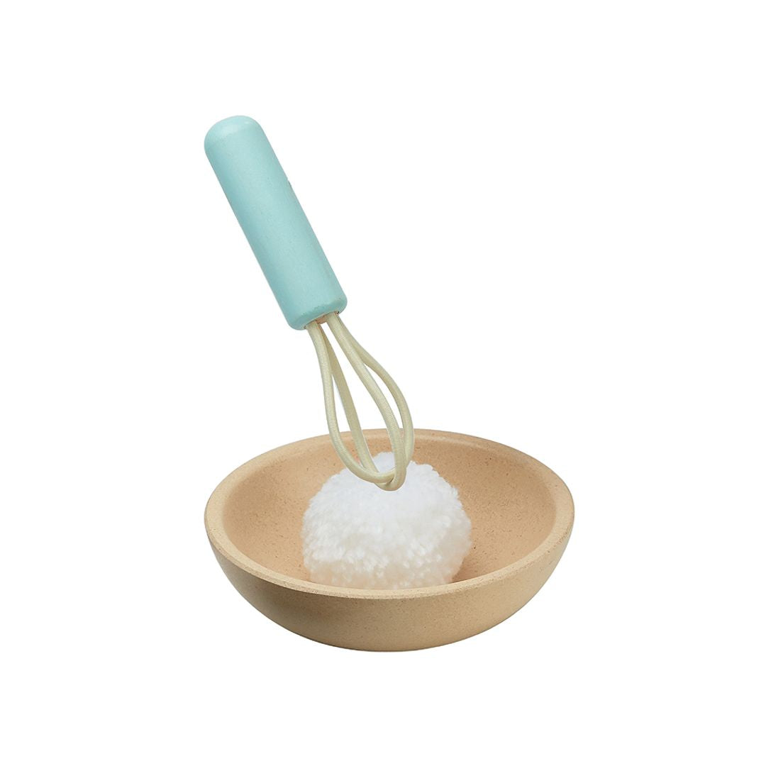 - The set comes with 1 whisk, 1 cup, 2 cupcakes, 1 baking tray, 1 spatula, 1 cream piping bag, 1 flour bag, 1 glove, and 1 flour pom pom