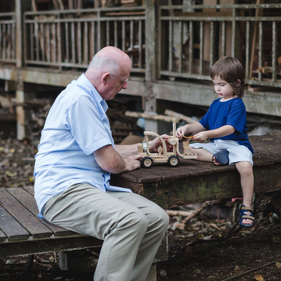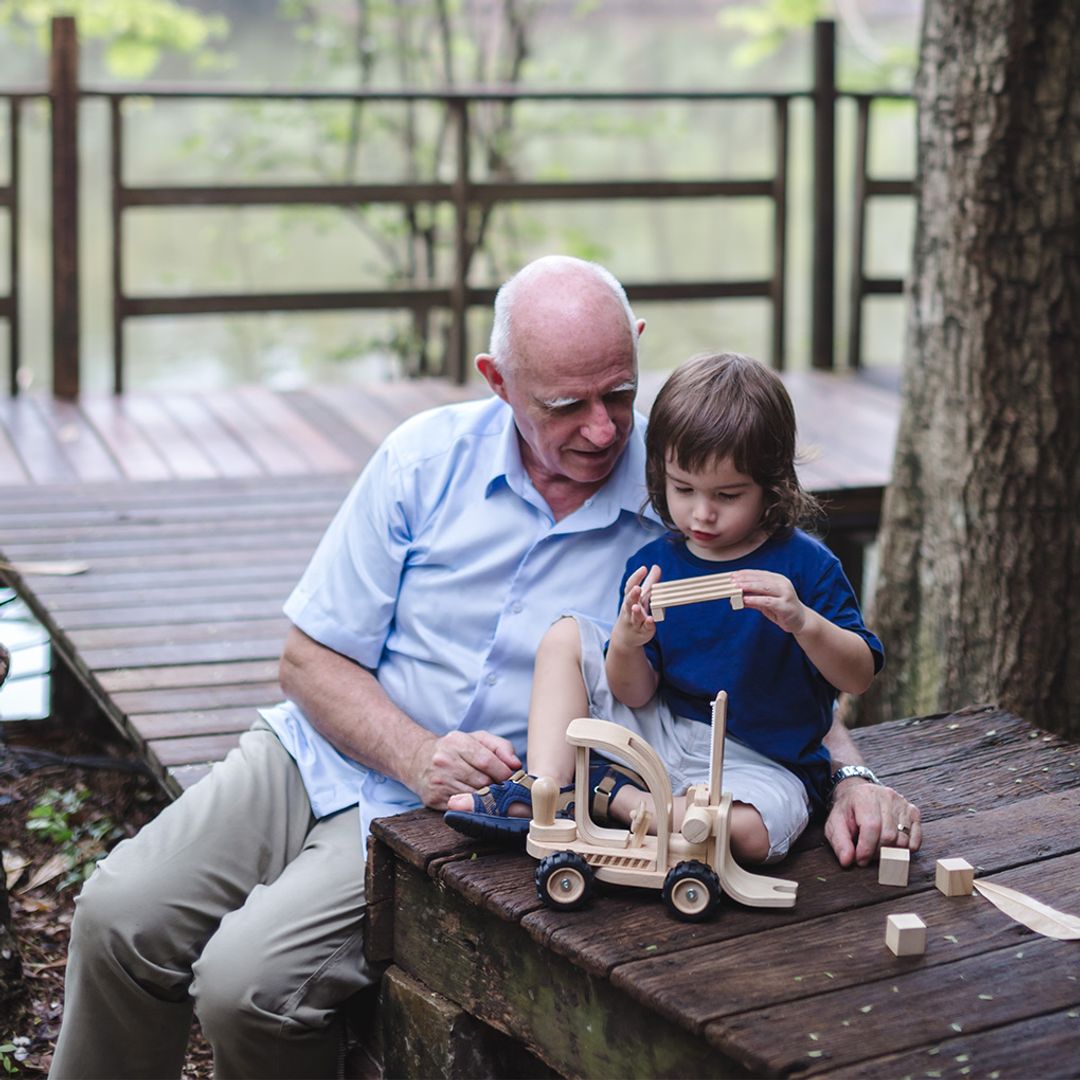 The design and function of this vehicle is based on a real forklift. The back knob helps direct the forklift from left to right, and the lift makes a sound when the side knob is turned to move the pallet and wooden cubes up or down.