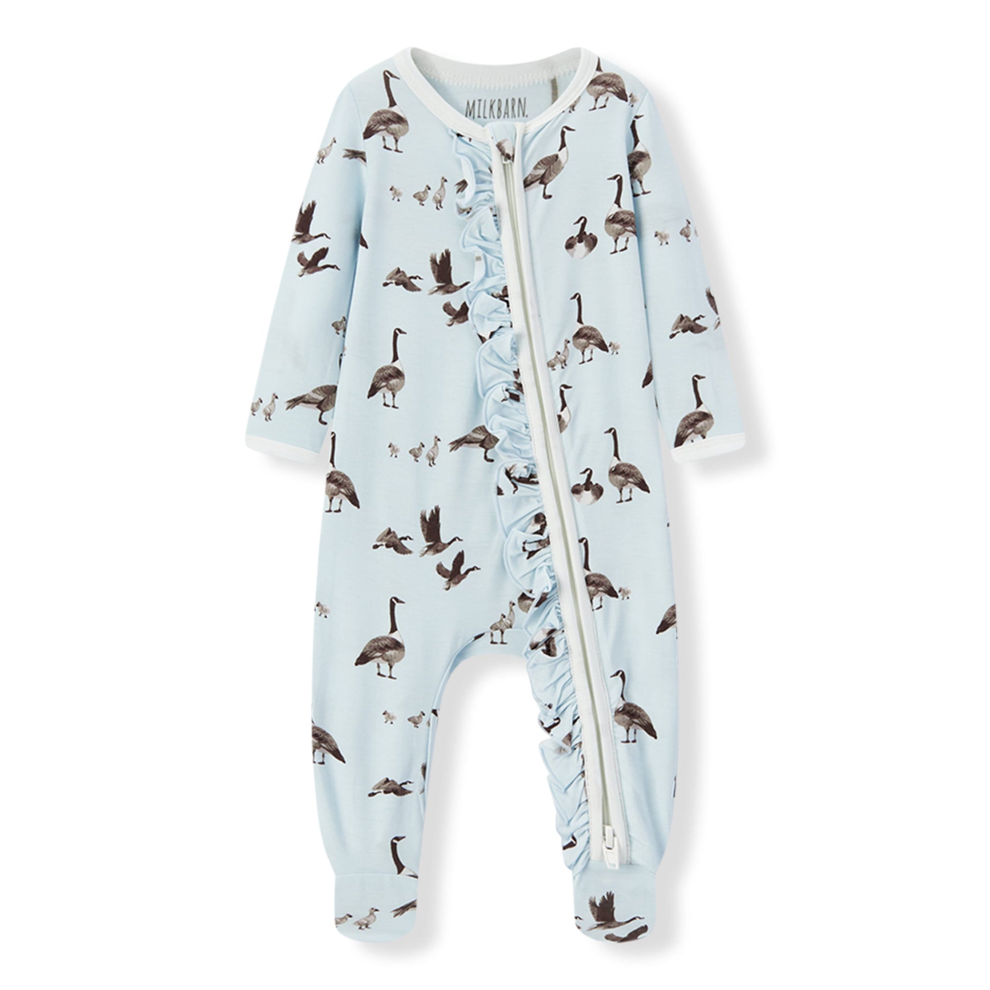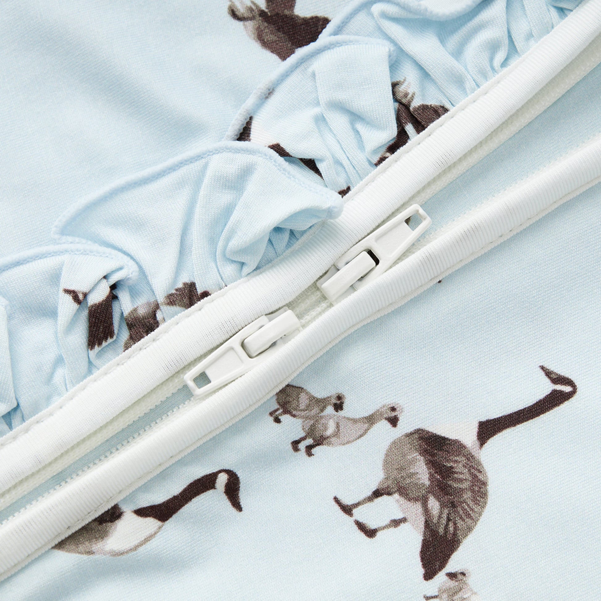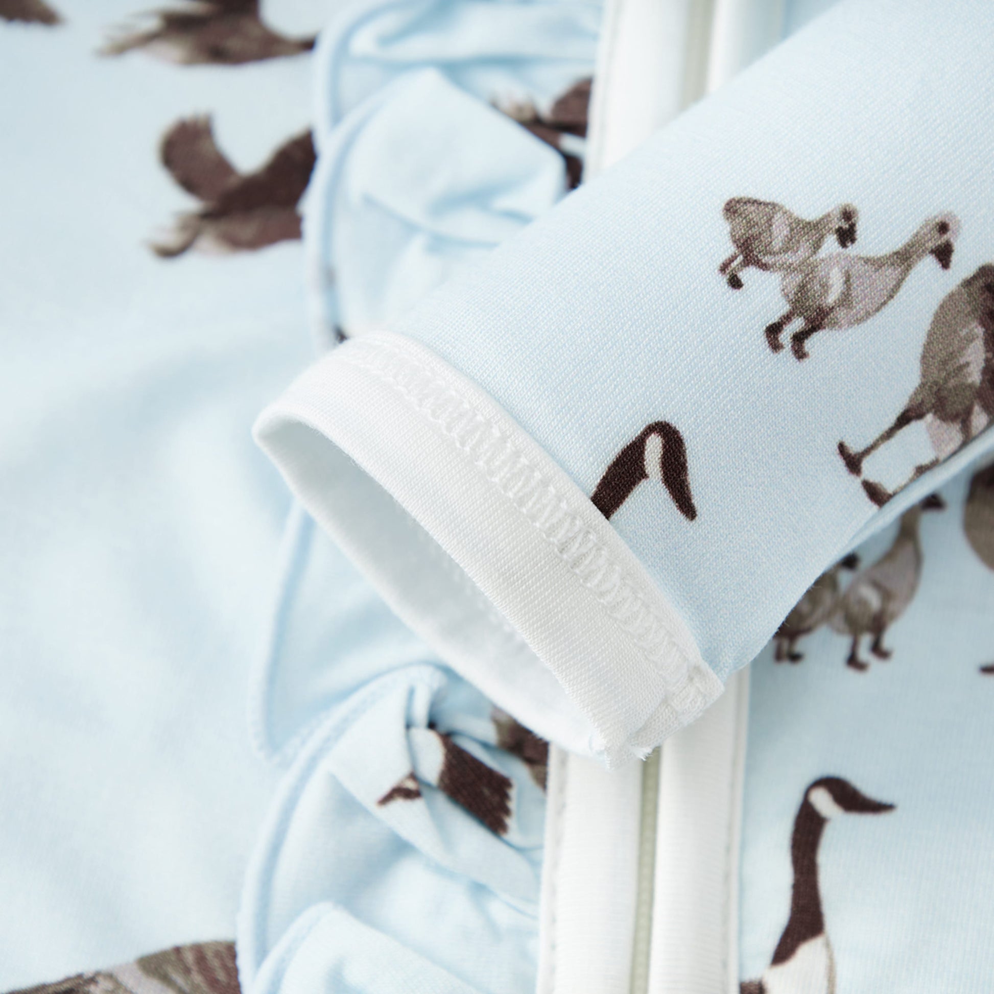 I zip, you zip, we all zip! Whether zipping from the top-down, bottom-up, or somewhere in between, we made changing and dressing just a wee bit easier with our baby Goose Luxe Stretch Ruffle Zipper Footed Romper. A subtle, ruffle-edged asymmetrical seam and three cascading, full-width rear ruffles add a little extra fun. With dual, two-way zippers and a closed-foot detail, this timeless classic blends design with functionality while wrapping your little ones in gentle comfort.