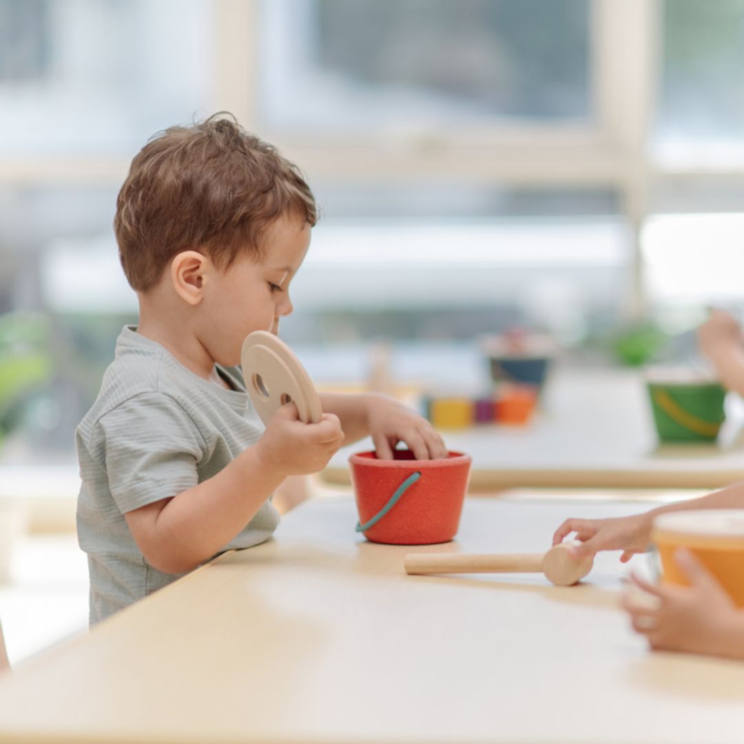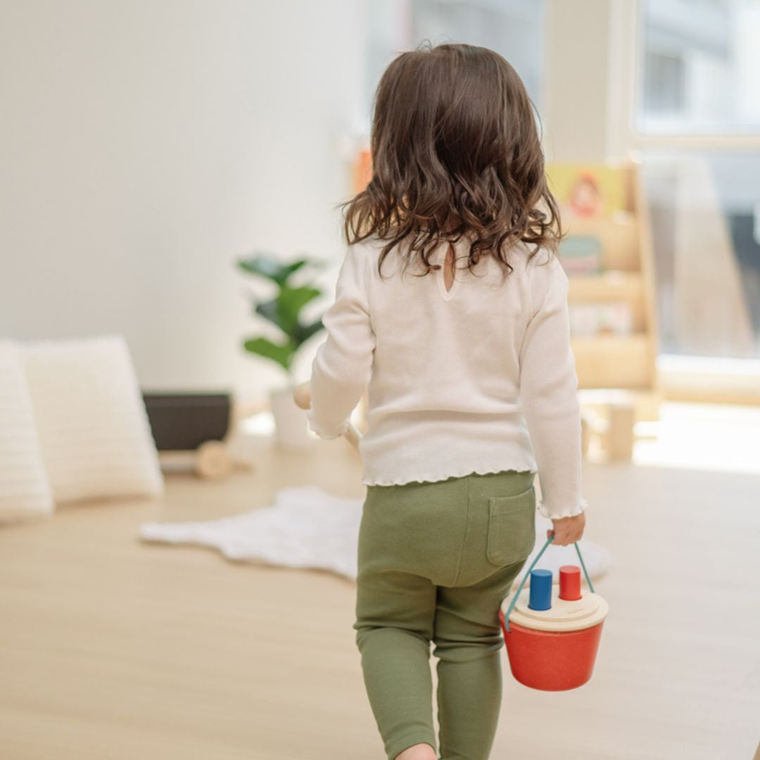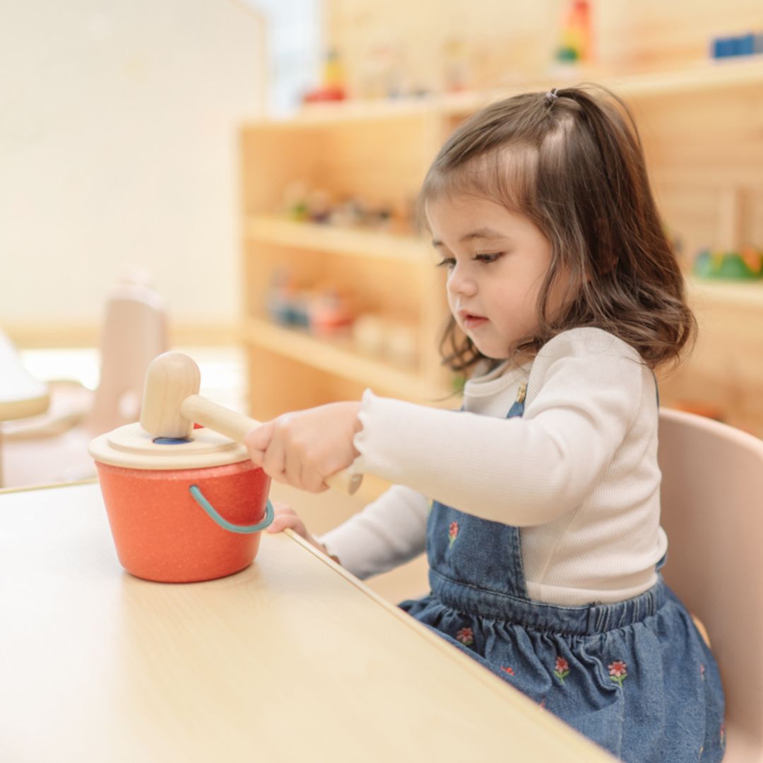 - Sustainably made in Thailand using chemical-free rubberwood, non-toxic glue, organic pigments, and water-based dyes. Set Includes: 1 bucket with lid (2 holes), 2 pegs (red & blue), and 1 hammer