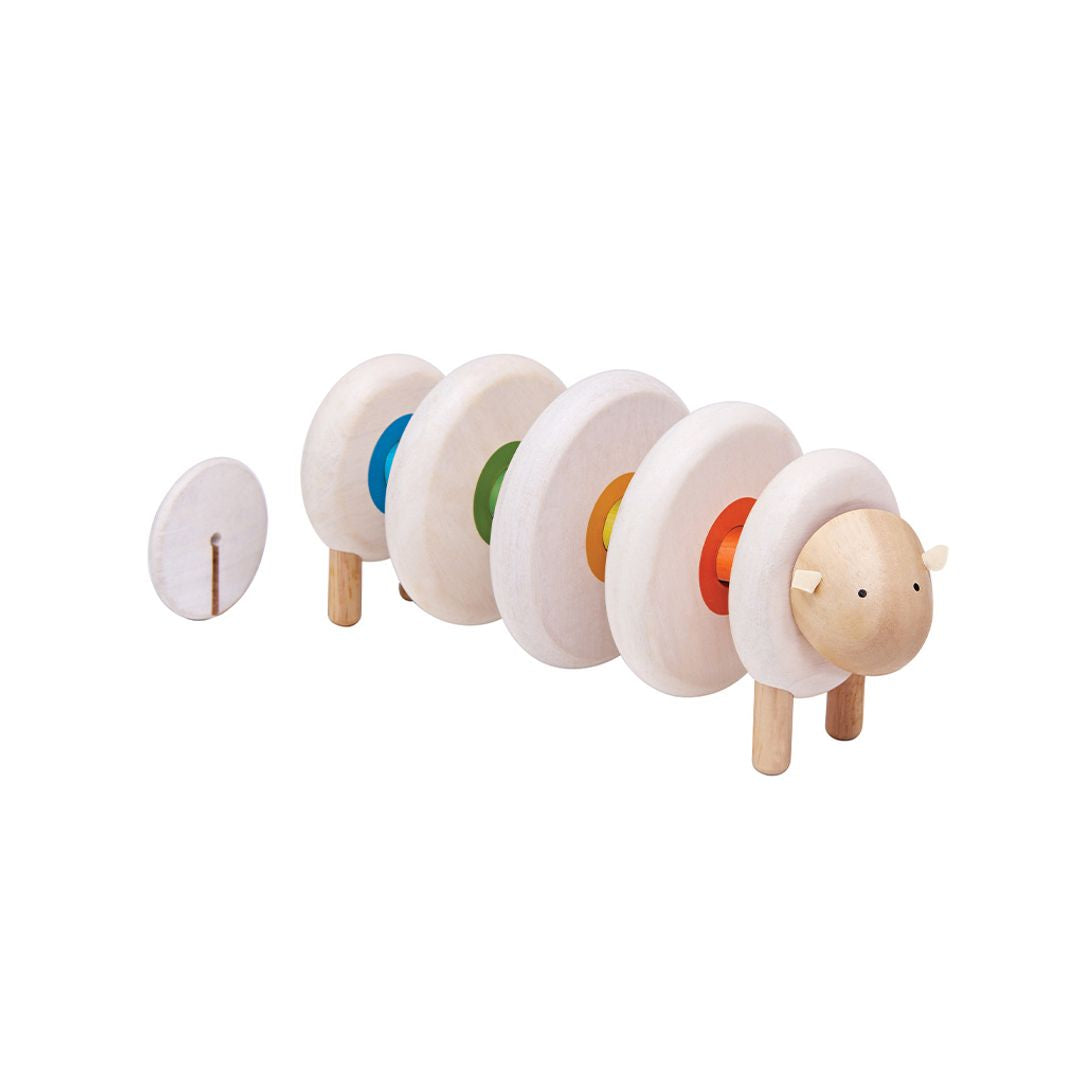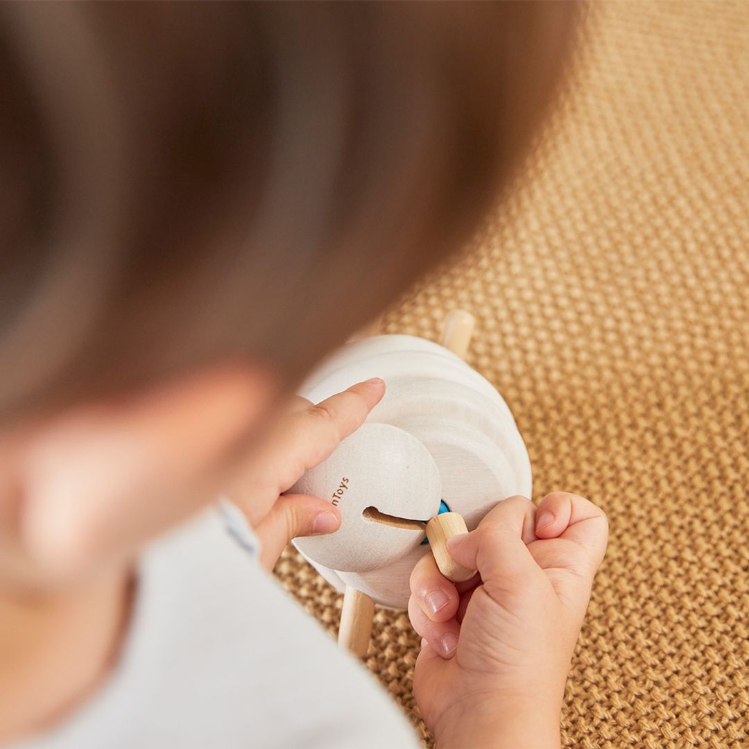 Children can lace corresponding colors together to form a sheep. The toy helps them learn basic colors and sequence.
