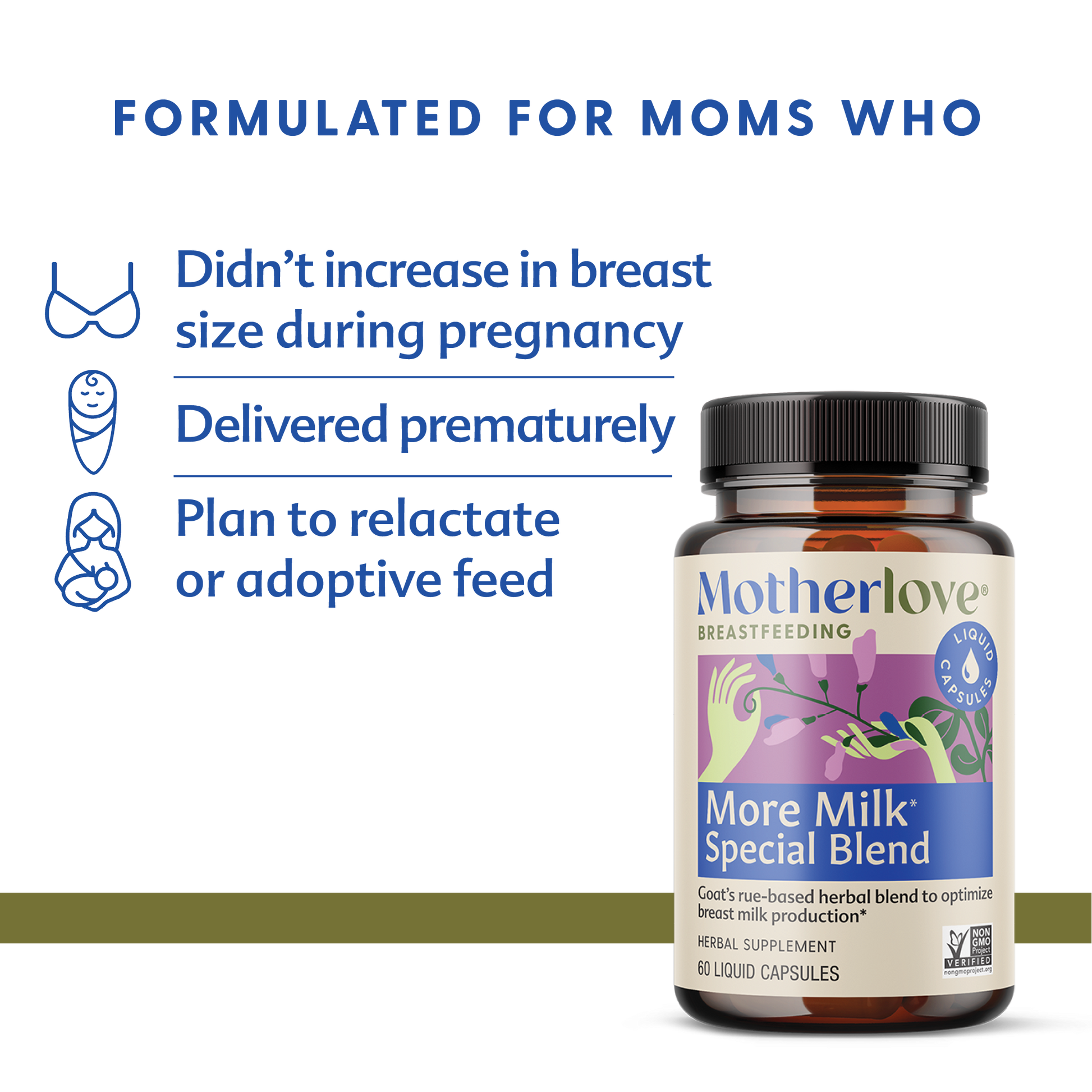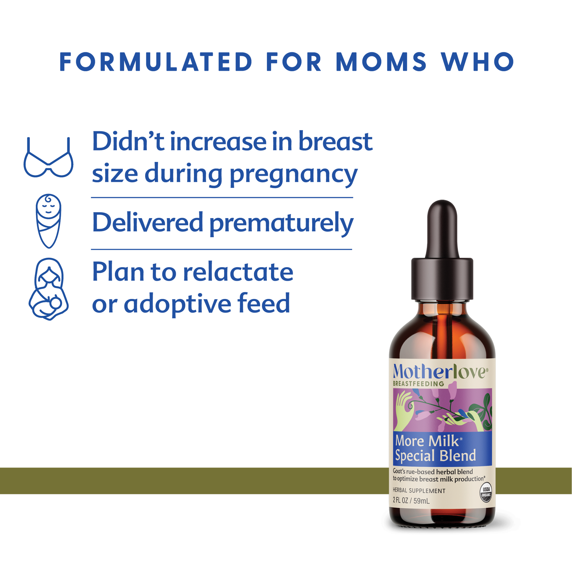 More Milk Special Blend is formulated for moms who didn't increase in breast size during pregnancy, delivered prematurely, or plan to relactate or adoptive feed.