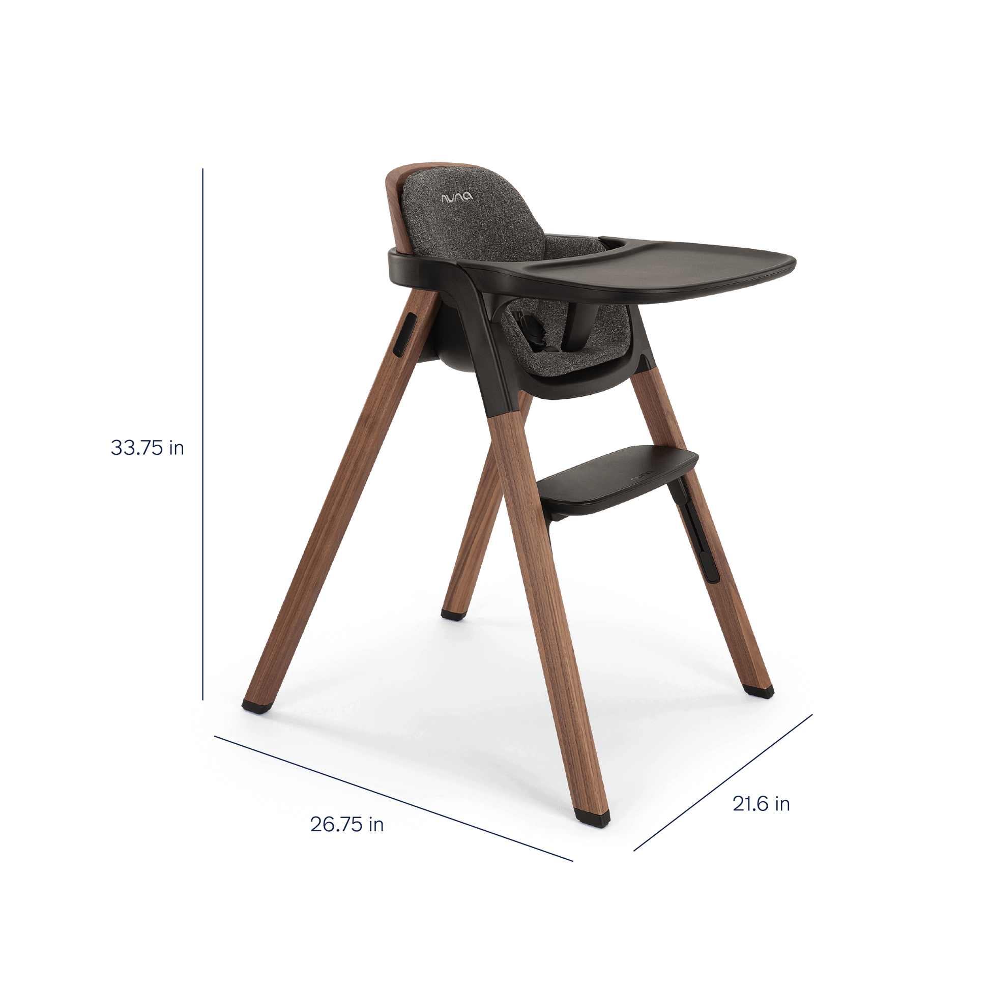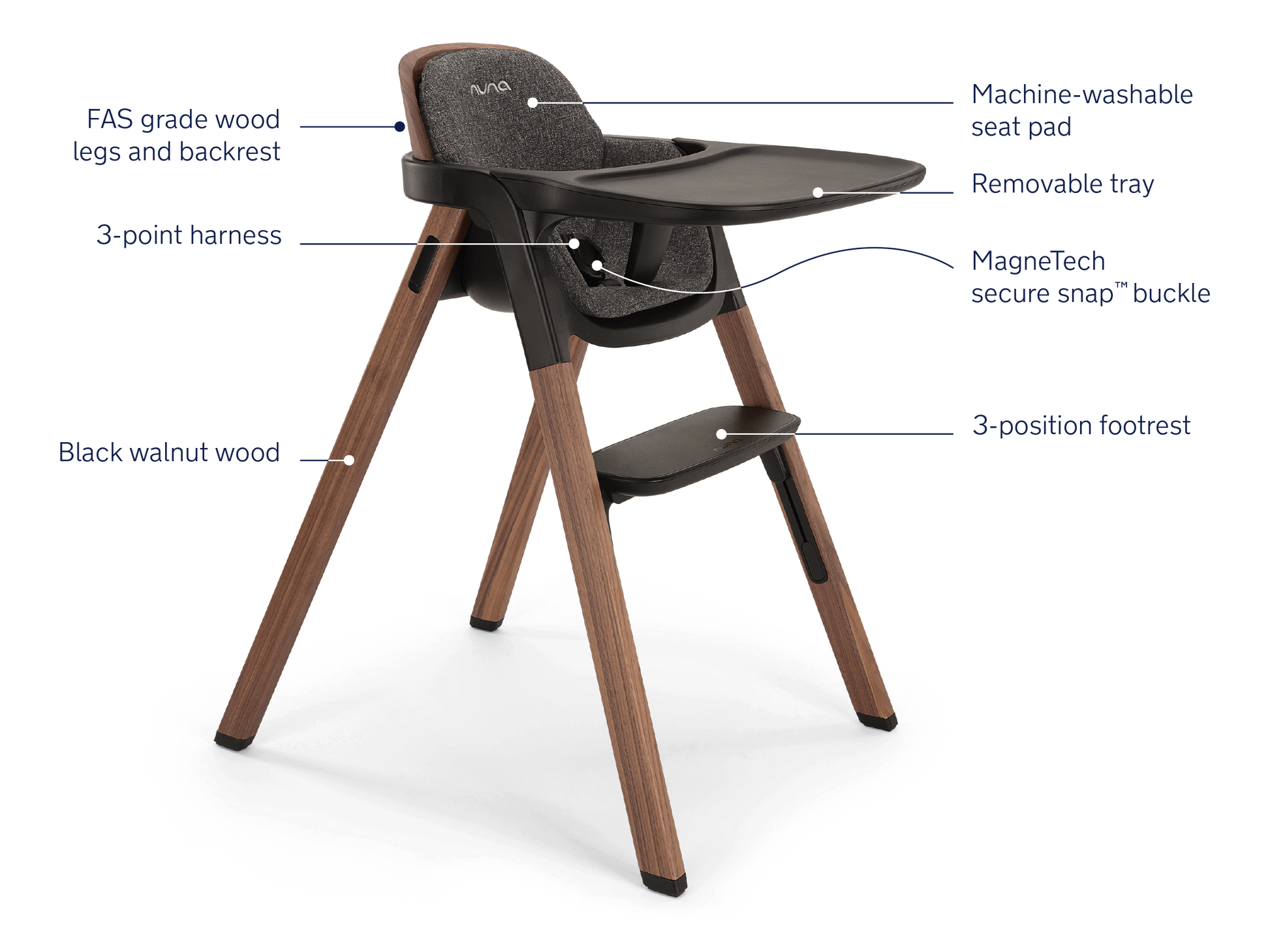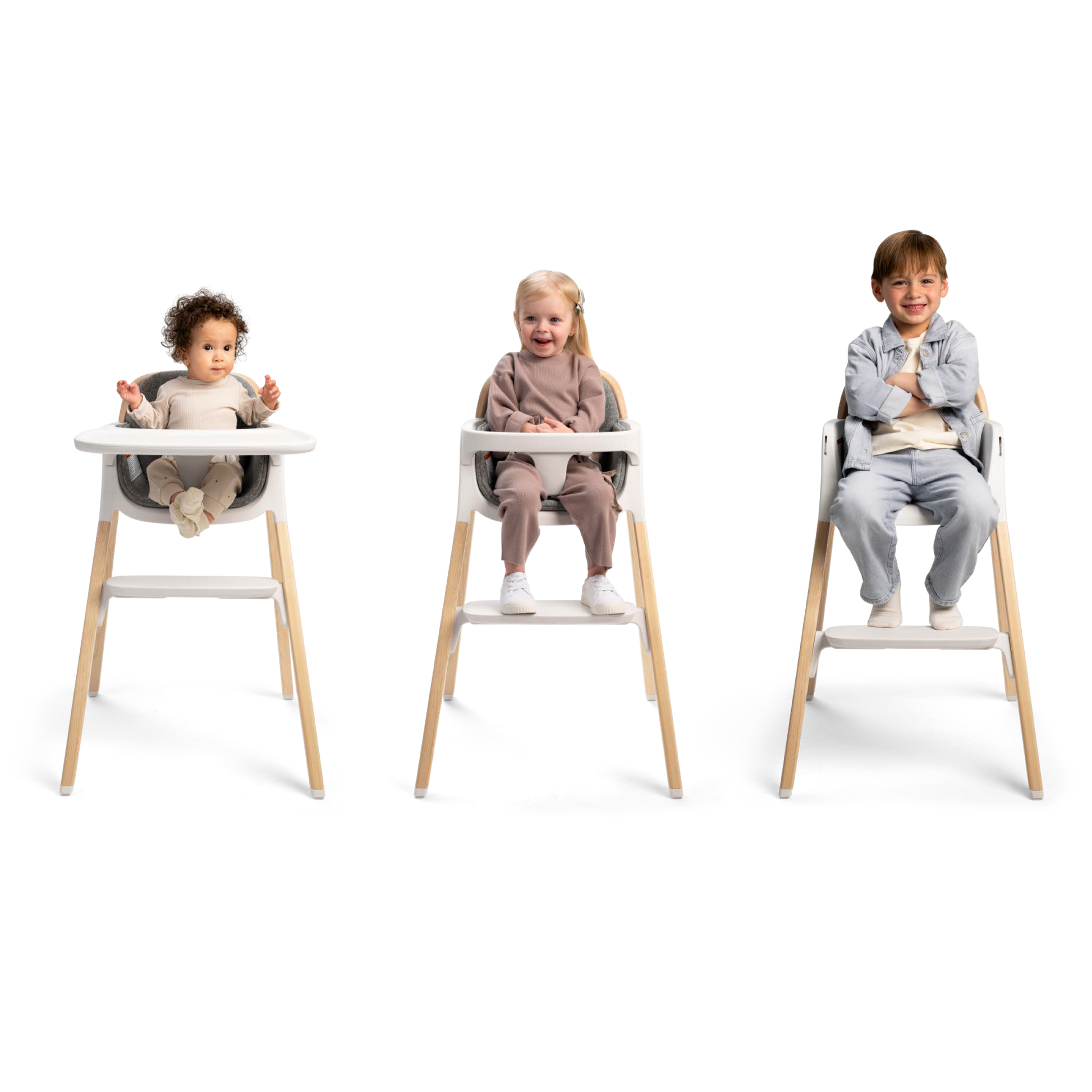Heirloom quality highchair with a timeless design that features wood accents and fits perfectly in the home for modern family meals.