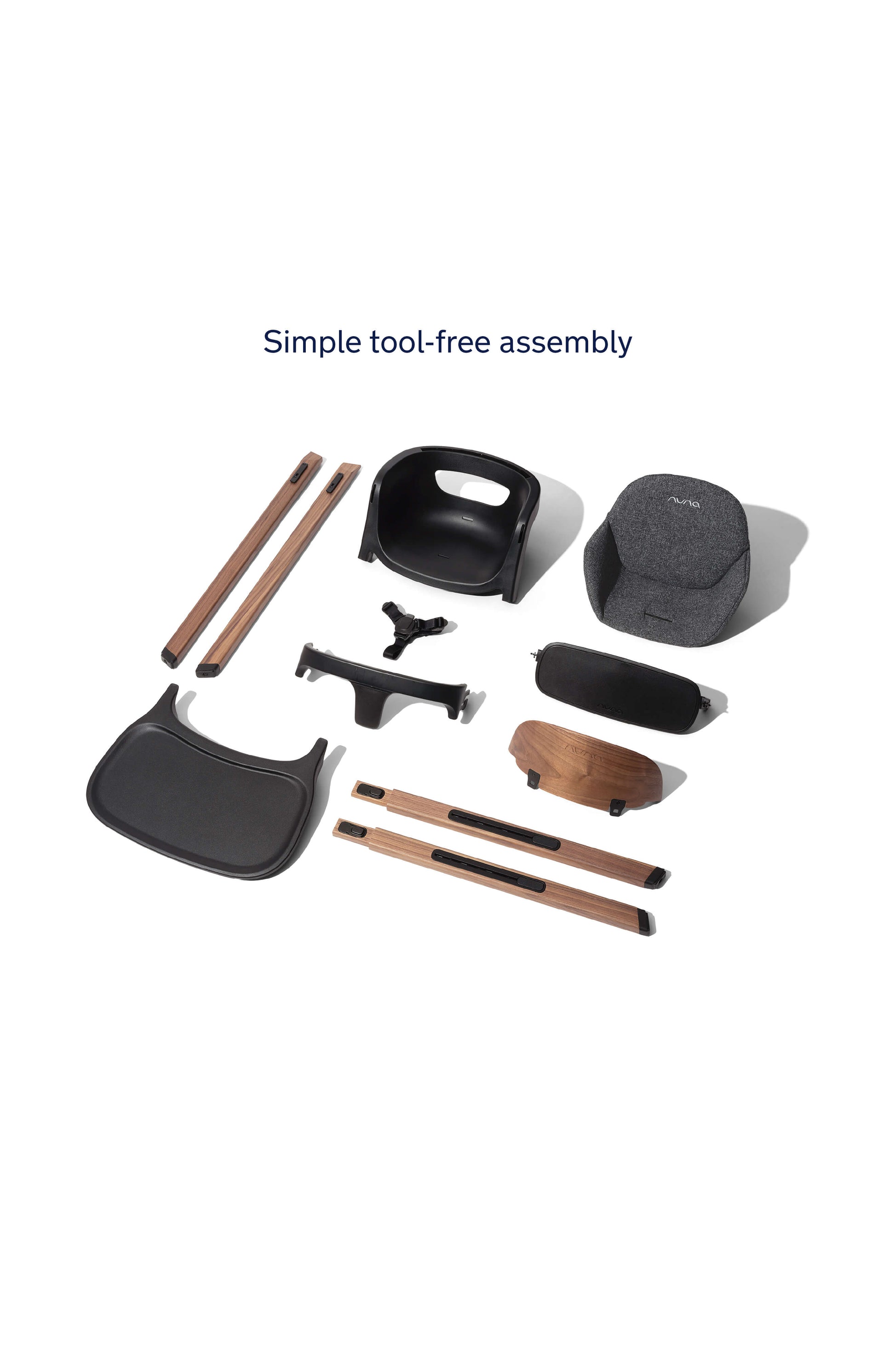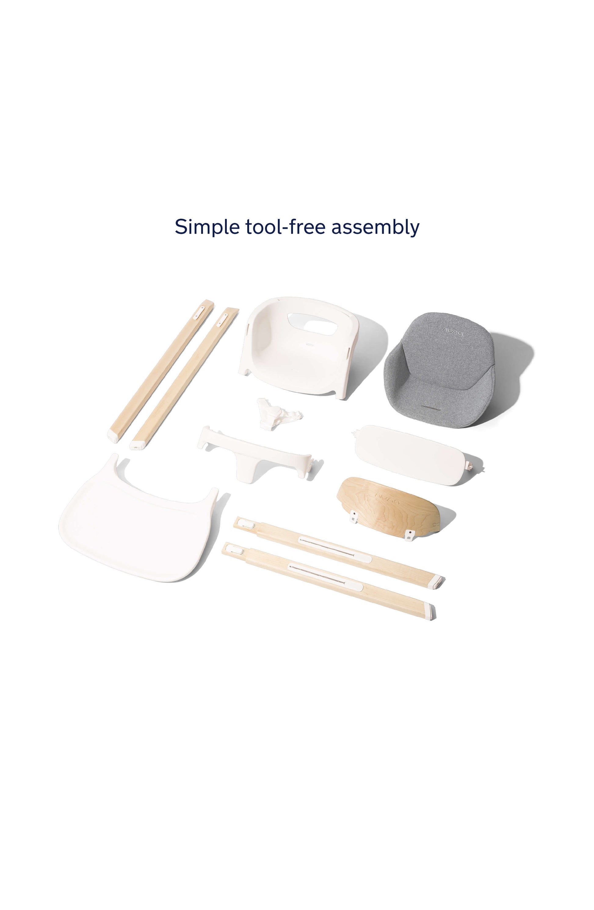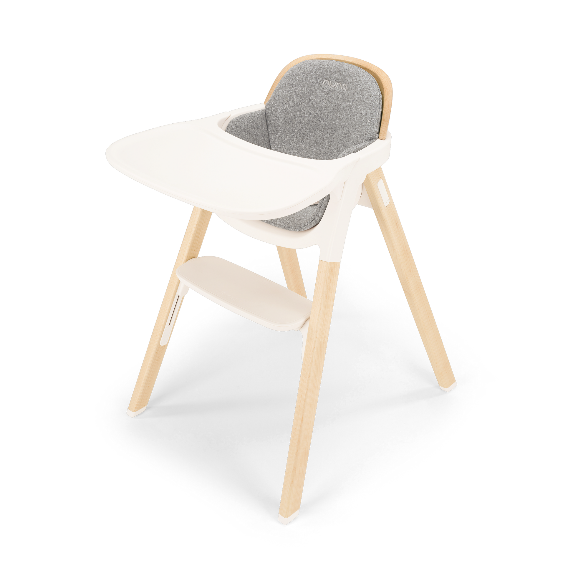 Heirloom quality highchair with a timeless design that features wood accents and fits perfectly in the home for modern family meals.