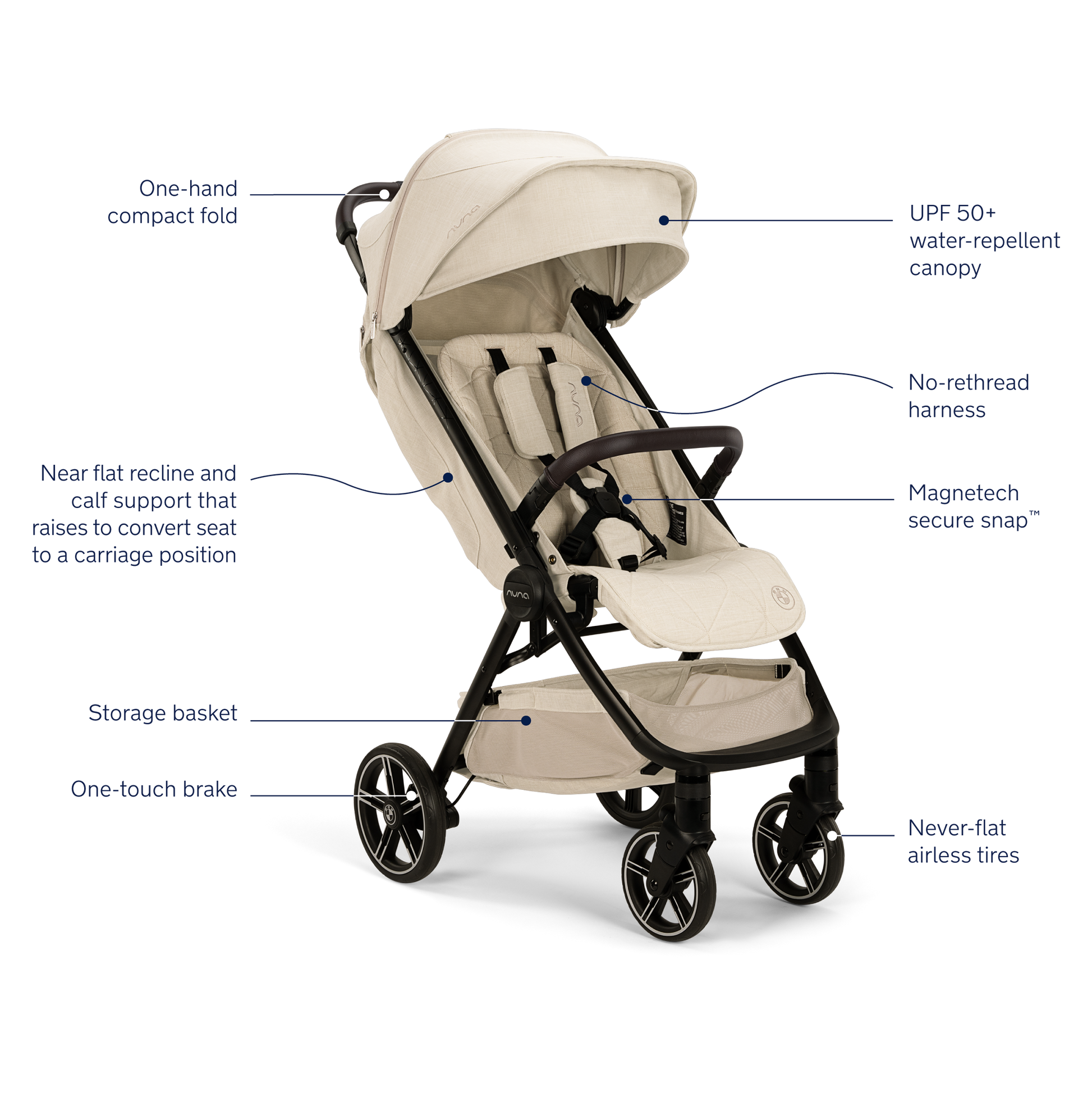 The TRVL lx stroller presents you with the compact freedom you need to get out and about, regardless of how near or far the journey leads. It’s designed to never weigh you down and has a one-handed fold that redefines what you’ve previously known about moving through your day with grace and ease. With its leveled-up wheel profile, you’re ready to navigate whatever the road ahead has in store.