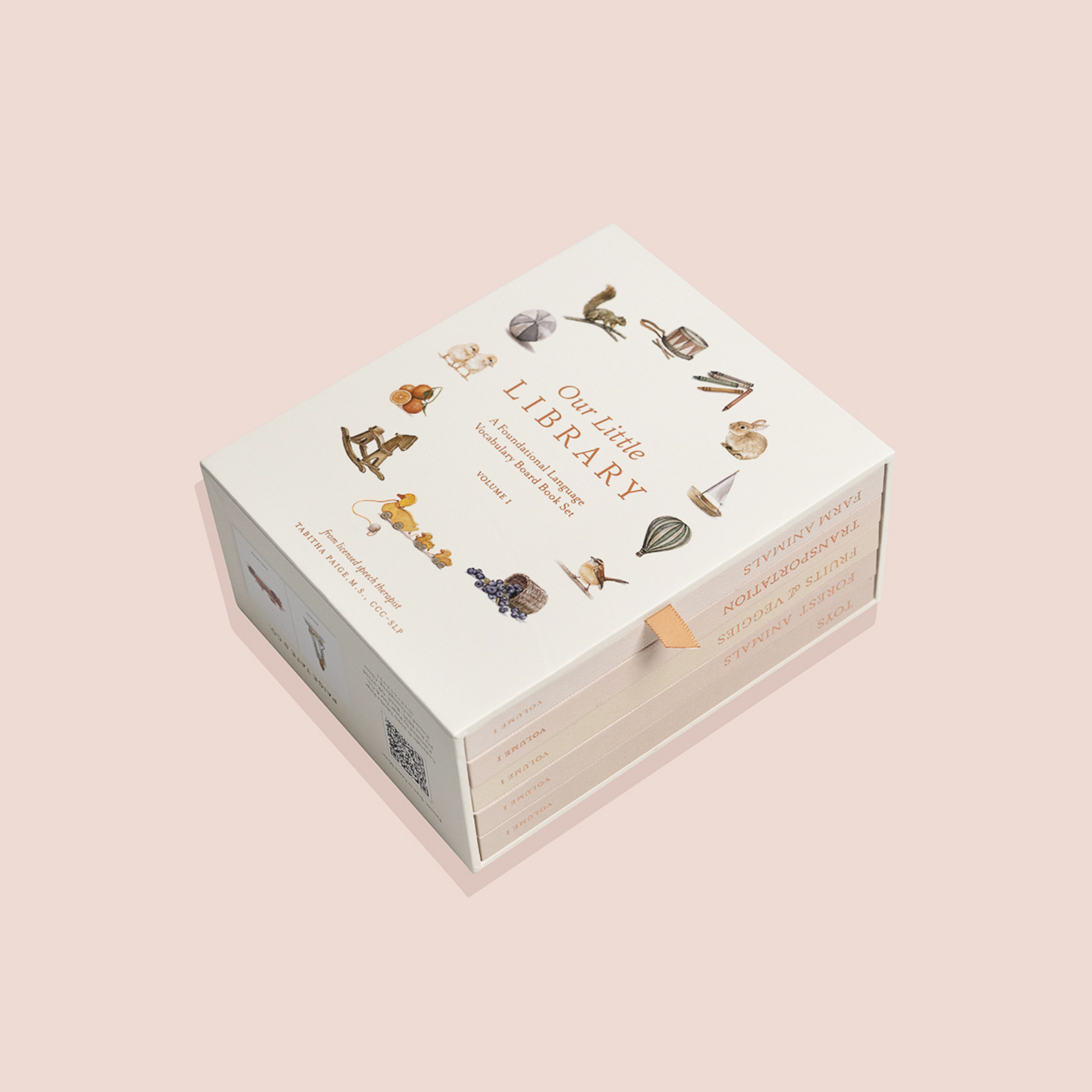 Designed by a professional watercolor artist and licensed speech therapist, Our Little Library features five board books that feature charming images and foundational vocabulary that will help you build your child’s vocabulary. The durable materials and small book size also make them perfect for your baby’s little hands.