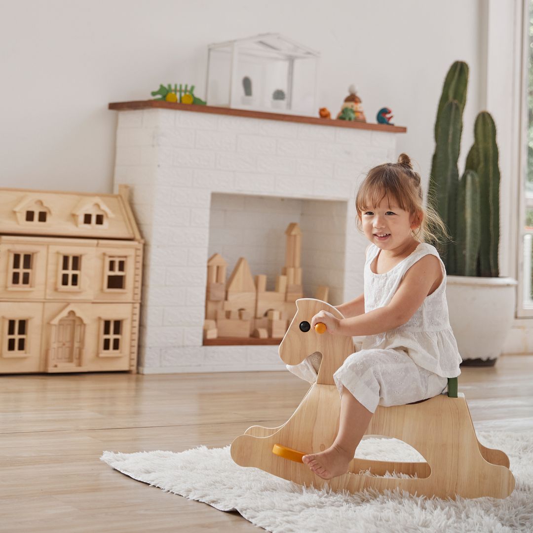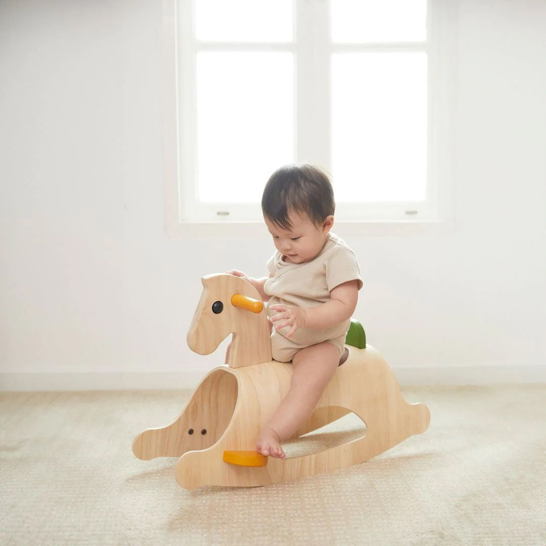 The PlanToys Palomino rocking horse is now available in the modern rustic colorway. It comes with a saddle and is built on parallel rockers so children can rock back and forth. - Built on parallel rockers for easy rocking back and forth - Safety stops are built in to prevent child from rocking to far forward or backward. - Comes with a built-in saddle and colorful accent