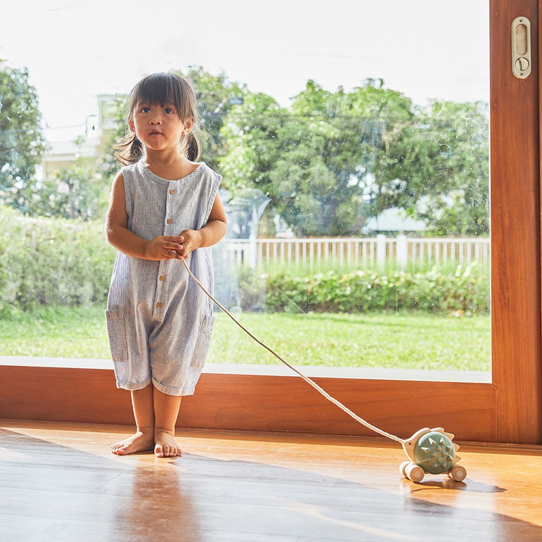 The Pull Along Hedgehog is ready to accompany your little one everywhere they go! When pulled, the hedgehog will let out a chime as a reminder that it’s not far behind. Available in two colors, this toy encourages children to develop gross motor skills, balance, and coordination.