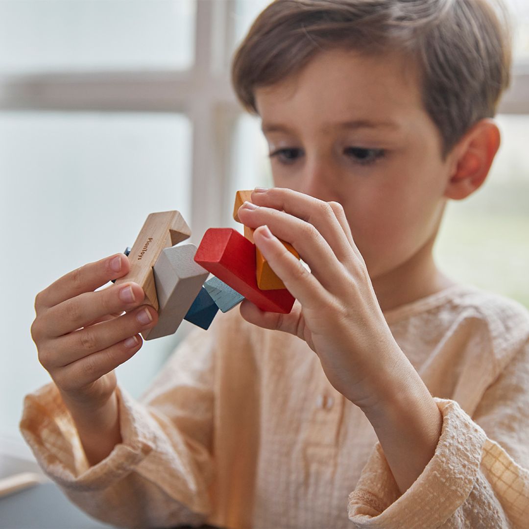 The PlanToys Rectangular Puzzle challenges your balance as you solve the puzzle. Through play, children will develop fine motor kills and hand eye coordination. You can play the Rectangular Puzzle in a number of ways. You can stack the pieces in various ways to create pattern and shapes. The ultimate test is to be able to stack the pieces together in the correct pattern to build that sturcture that does not fall apart. It will chanllenge you to think systematically and your hand eye coordination to get the pieces in place at the same time. The puzzle comes with 6 pieces total.