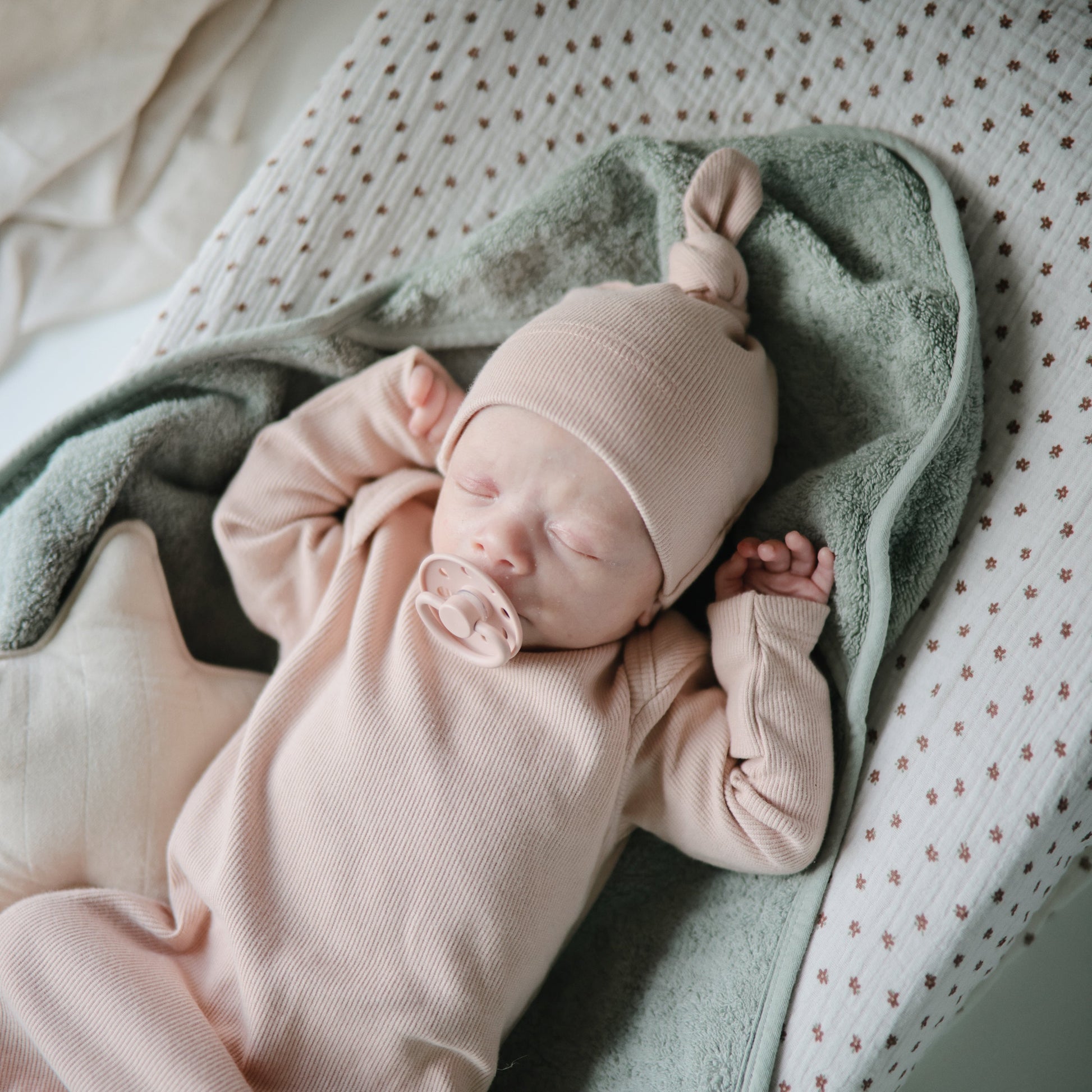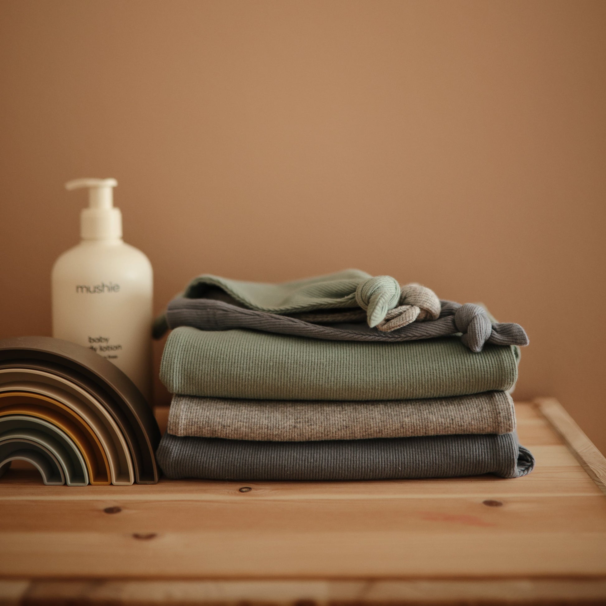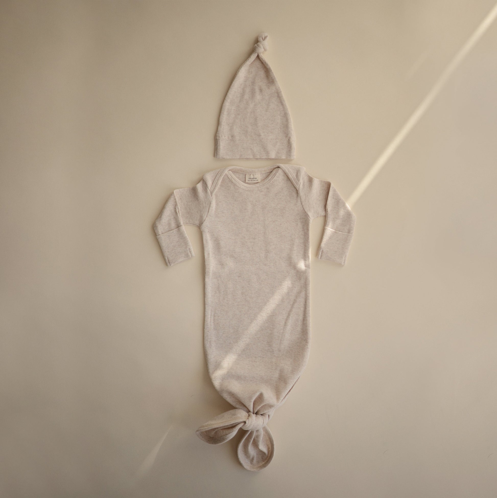 Pairs well with the Mushie Ribbed Knotted Baby Gown.