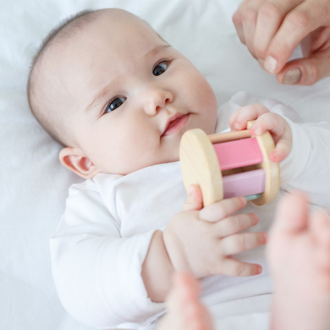 This toy creates a sound when rolled. It also stimulates sight and hearing sense.
