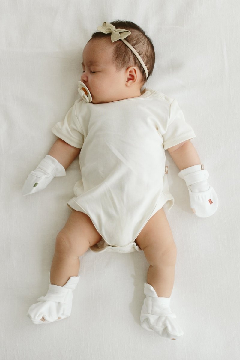 A super-soft baby boot and mitt duo that are adjustable and stay on, no matter what!
