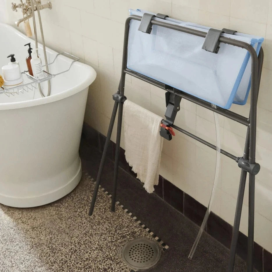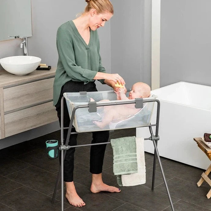 The Stokke Flexi Bath Stand is designed to bring you and your baby closer for bath time bonding and fun. Made exclusively to fit the Stokke Flexi Bath; it’s designed for safety, ease of storage and convenience with everything close at hand. The tub lock also means the stand stays folded and erected unaided. It’s also one of the first stands to meet the new EU regulations for bath stands (EN 17072:2018). Can be used for bathing newborns and right up until they can stand unaided. Avoid backache from kneeling on the floor with this sturdy, ergonomic bath time helper. Made with functionality, comfort and bonding at the core.