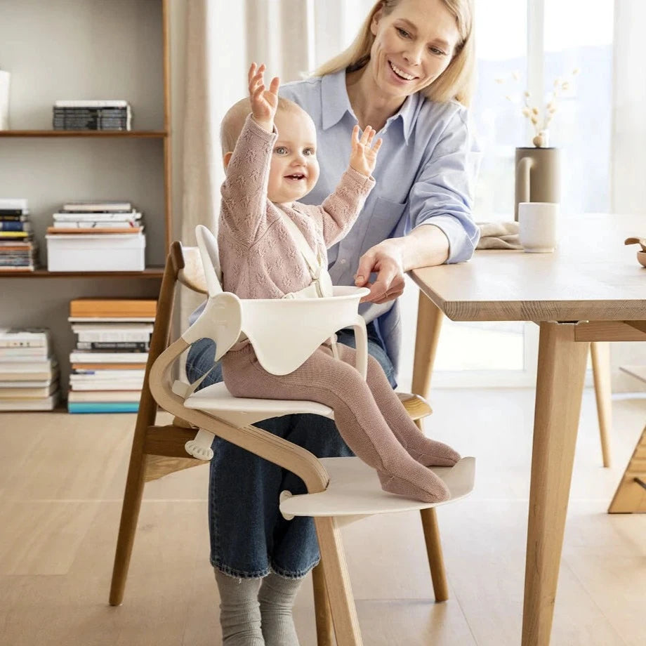 The Stokke® Nomi® chair & the Stokke® Nomi® Baby Set – they're better together! Select the Stokke® Nomi® chair in the color of your choice to save on the Baby Set when you buy them as bundle. This allows you to bring your baby to the family table for bonding from when your child is able to sit unaided (approx. 6 months). Much like a protective arm around your child, the Stokke® Nomi® Baby Set offers your baby comfort and support as they're learning to sit while still allowing them freedom of movement. Easy to attach, the Baby Set simply clicks on, first underneath the seat and then on the backrest. The rounded, organic contours create a comfortable highchair with unrestricted movement – which is excellent for toddler's development as they explore, taste and interact at the family table. When your child is ready to climb up and down from the chair without help, it is time to remove the Stokke® Nomi® Baby Set.