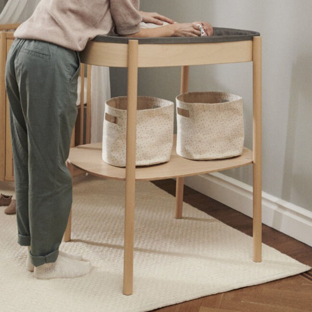 An elegant and practical basket, ideal for the Stokke Sleepi Changing Table. Made in durable 100% cotton canvas with a dotted print. Wash it by hand if needed.