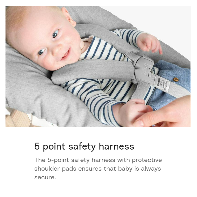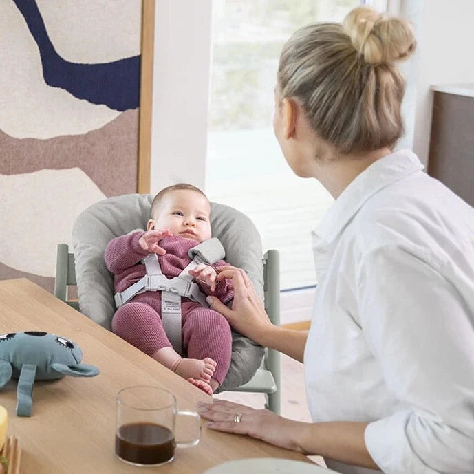 The Tripp Trapp Newborn Set is designed to encourage bonding from the very beginning. Comfortable and ergonomic, it cradles your newborn, lifting them to table height. Now with 2 angle adjustable positions and excellent leg support, your little one is assured a cozy, nest-like environment they are sure to enjoy. This enables eye contact, promoting interaction during meals and gatherings around the table. It´s a great way to keep your baby close while building strong relationships with the whole family. Safe and simple to use, the Newborn Set can easily be attached and removed from the Tripp Trapp chair. Red-green indicators reassure you that it is mounted correctly while a 5-point safety harness with protective shoulder pads keep baby extra secure. The toy hanger lets your little one keep their favorite toy close at hand to keep them entertained while helping to stimulate their evolving motor skills. Suitable from newborn up to 9kg.