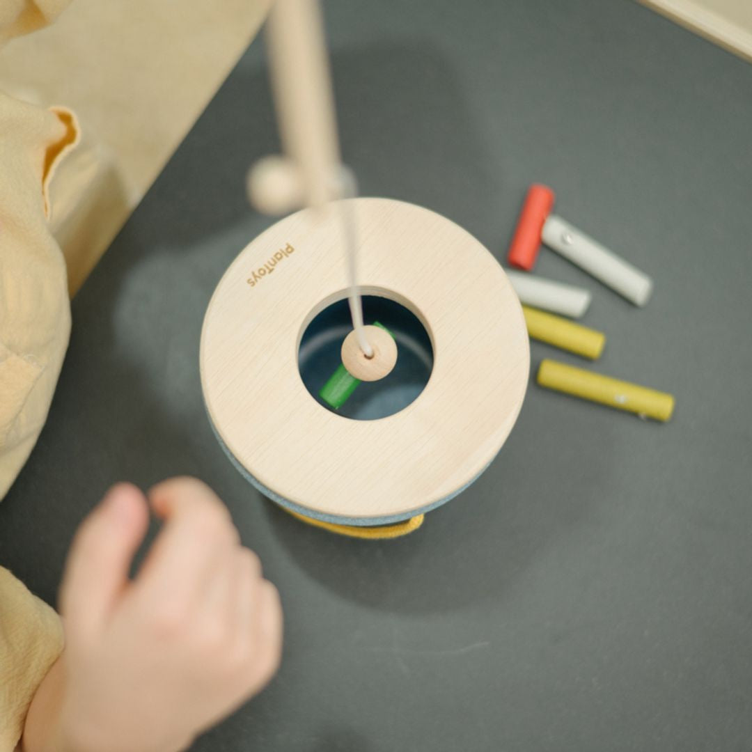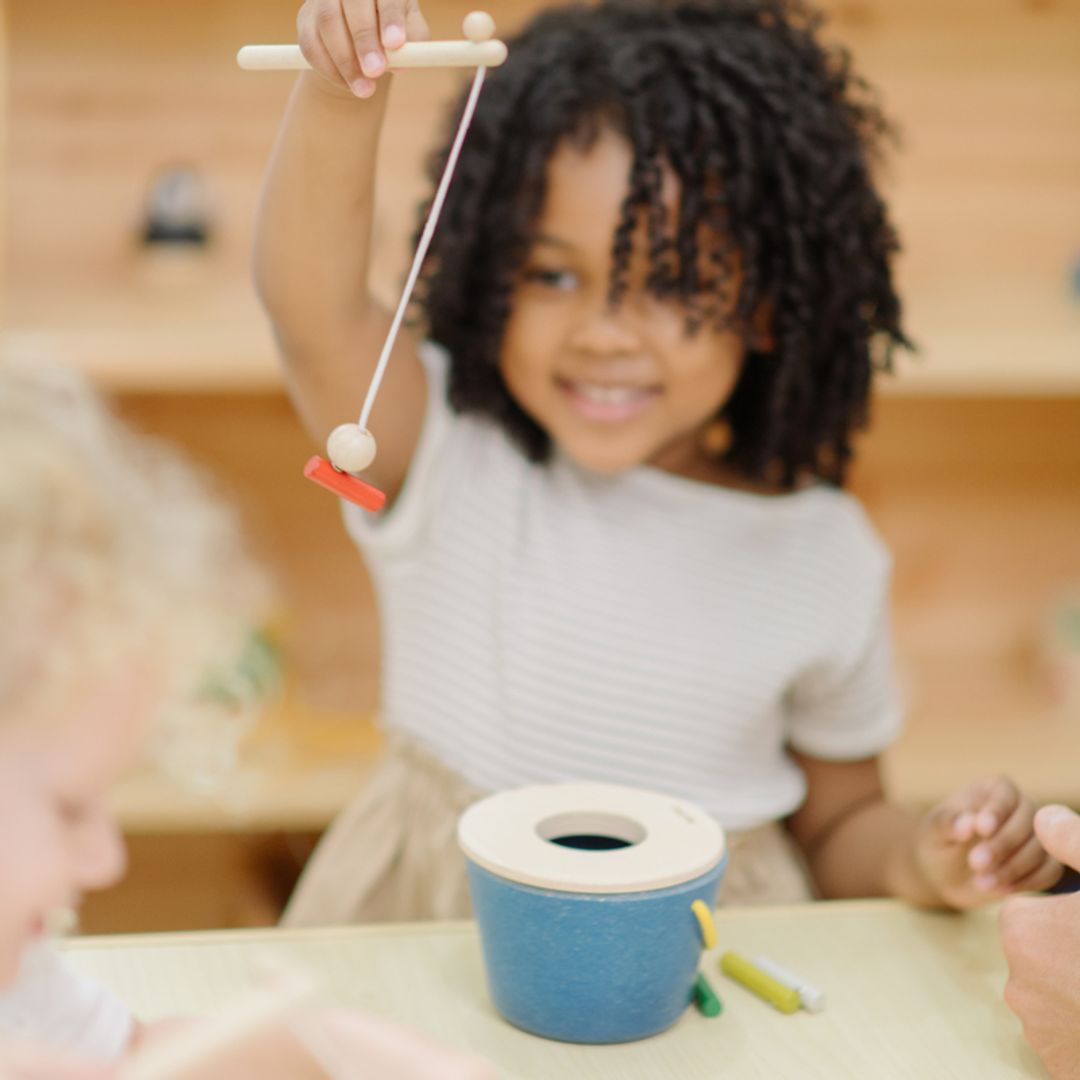 "This magnetic fishing game enhances focus, precision, and hand-eye coordination as children use the fishing rod to ""catch"" wooden logs. As they engage with this toy, they strengthen fine motor control, spatial awareness, and problem-solving skills while discovering cause-and-effect relationships. The magnetic tips offer a fun and interactive way to reinforce grip control and coordination. Children also practice concentration as they aim and ""catch"" the logs, developing their hand-eye coordination in a playful, hands-on way. This toy encourages trial-and-error learning and independent play, providing opportunities for children to build confidence while exploring basic concepts of size, shape, and spatial relationships. Set Includes: 1 bucket with a lid, 1 fishing rod, and 8 cylindrical pieces."