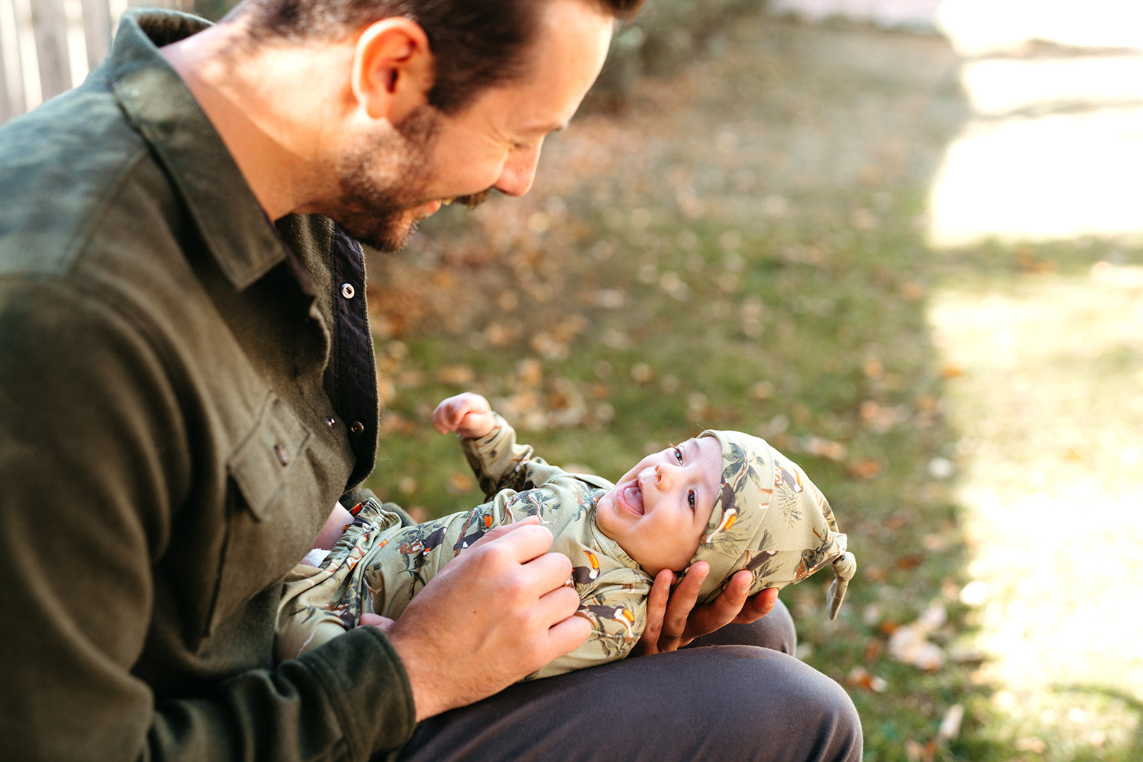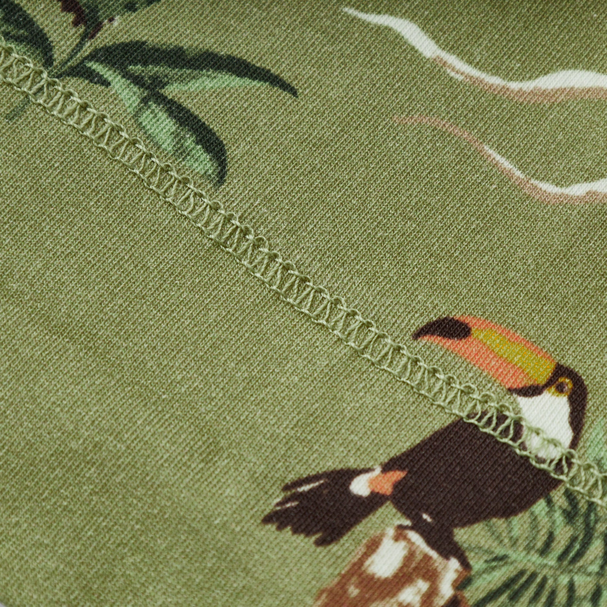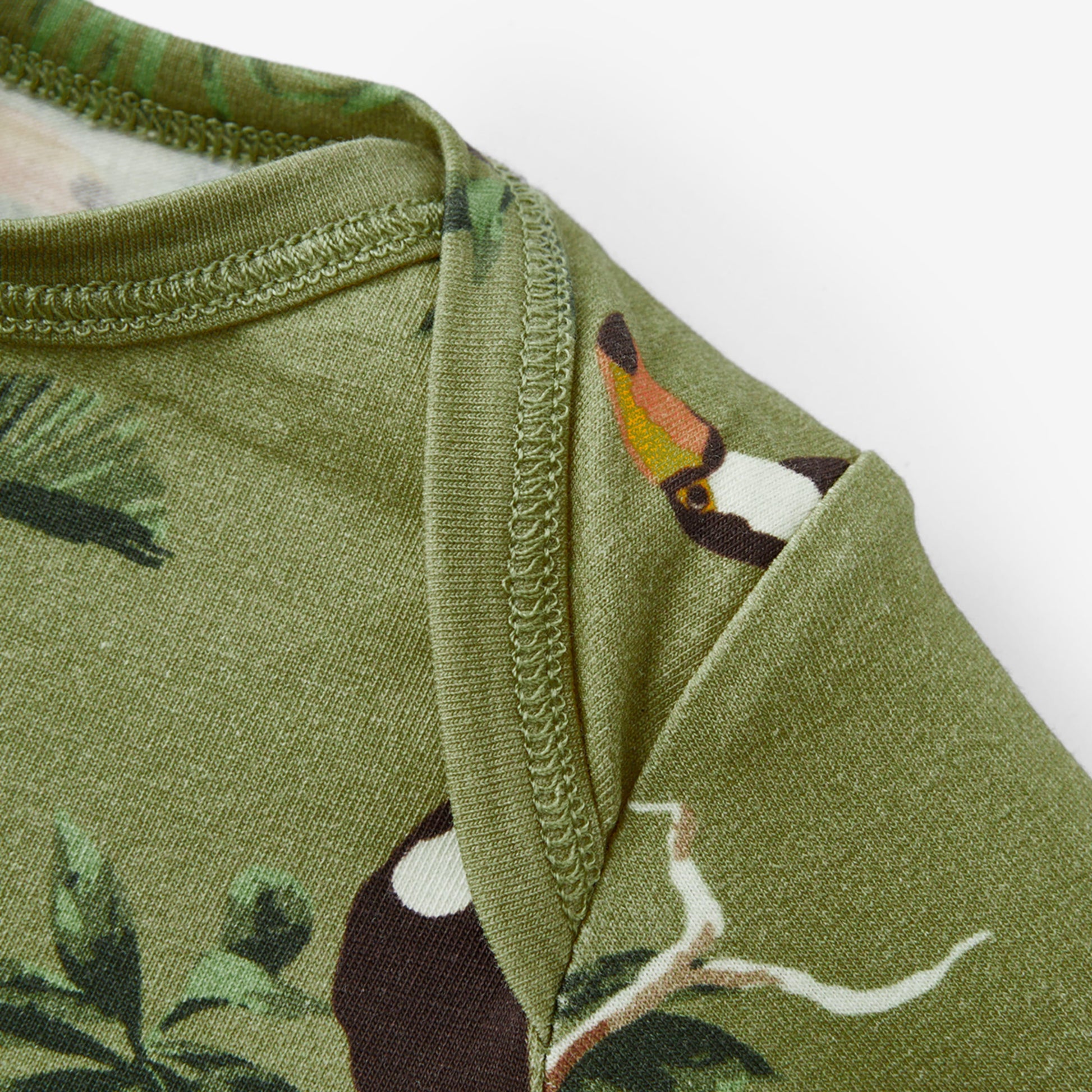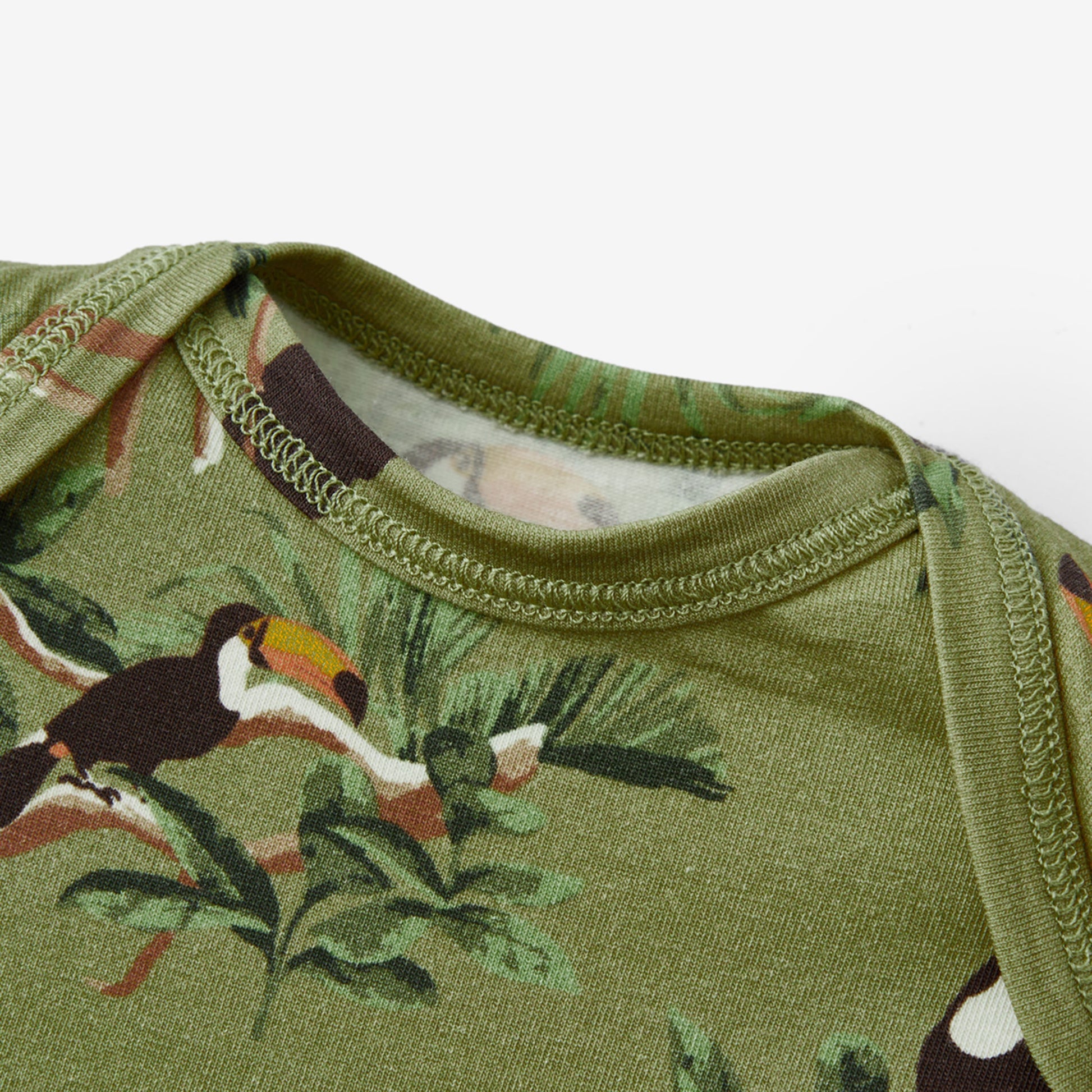 From that first emotional trip home to the initial months of bonding in the rocking chair, we highlight the beauty of your bundle of joy in our cozy, newborn Cotton Stretch Gown & Hat Set in the Toucan print. The coordinating knotted hat adds warmth, the fold-over hand covers provide added protection, and the soft elastic bottom and envelope neckline allow for ease of changing. Pair our Gown & Hat set with our coordinating Swaddle blanket or Burp Cloths for that perfect ensemble.