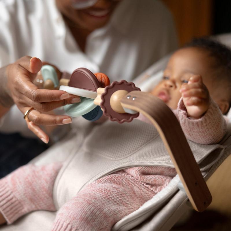 A cozy place to play or lay, the Mira was designed to soothe and comfort baby while keeping them close. Following their natural movement, the 2-in-1 bouncer and seat gently rocks to their rhythm from newborn to toddler.
