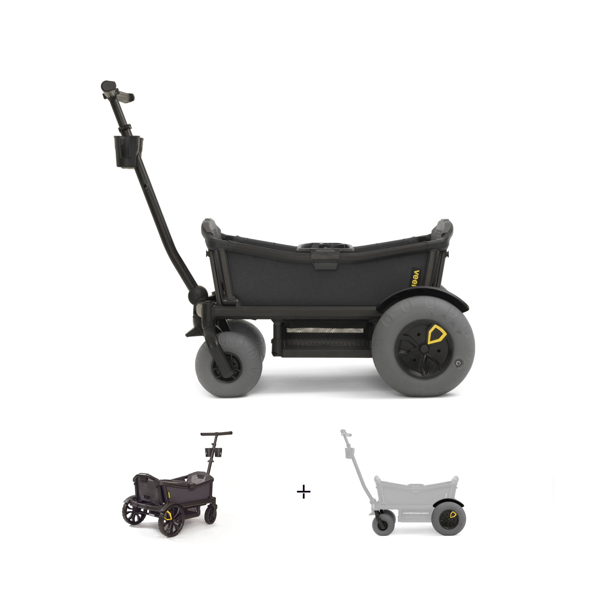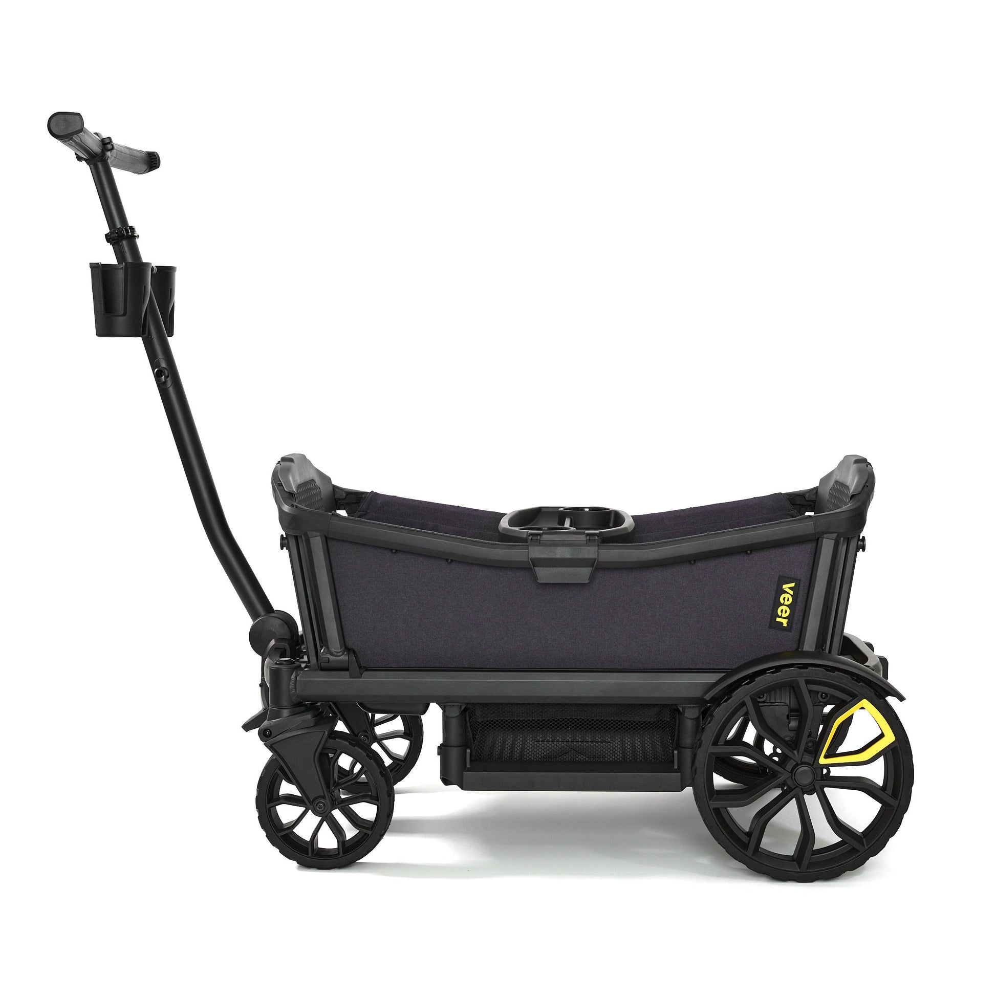 (1) Veer Cruiser: The world’s first stroller-wagon crossover that blends the feel, functionality and safety of a premium stroller with the classic fun of a wagon. Built for smooth wagon steering on all terrains, Cruiser comes equipped with 2 Cup Holders and a Drink & Snack Tray with seating for two (stock wheels included).
